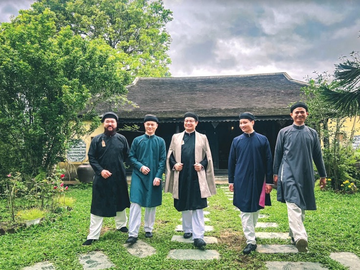 Cán bộ Sở Văn hóa và Thể thao tỉnh Thừa Thiên Huế mặc áo ngũ thân trong Lễ Hạ nêu - Ảnh: Philip