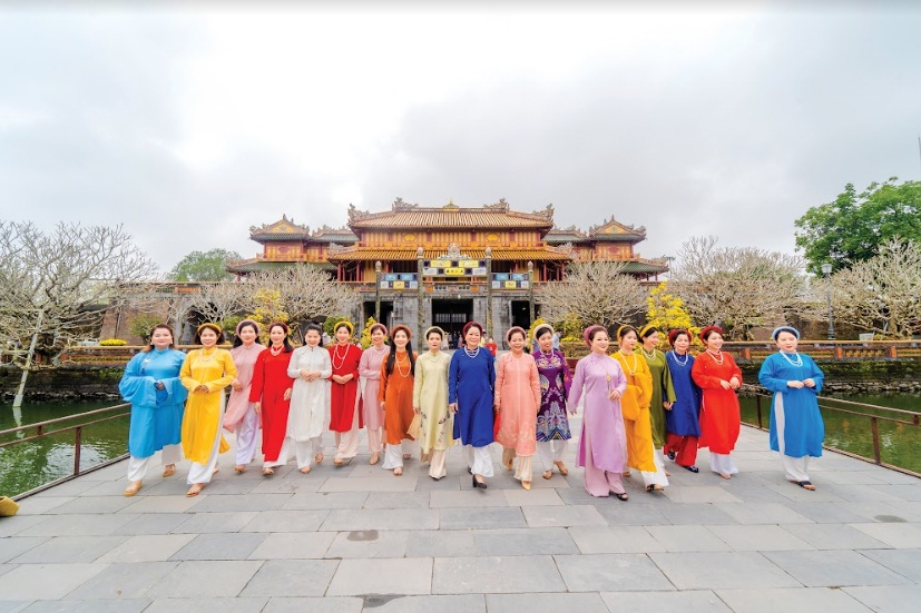 Cán bộ Hội LH Phụ nữ tỉnh Thừa Thiên Huế mặc áo ngũ thân tham quan Hoàng cung Huế - Ảnh: Bảo Minh