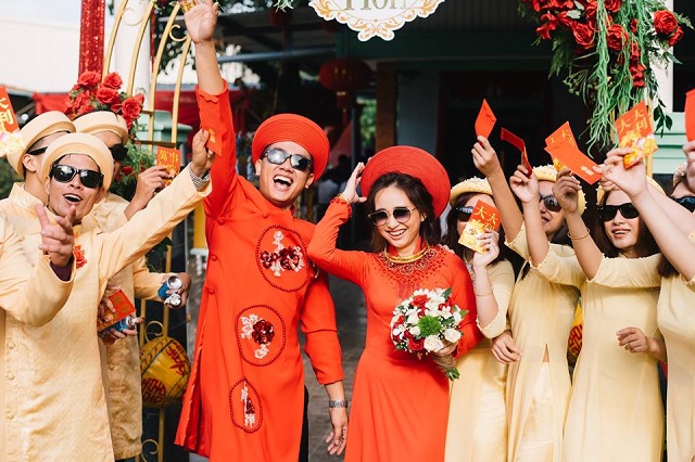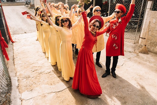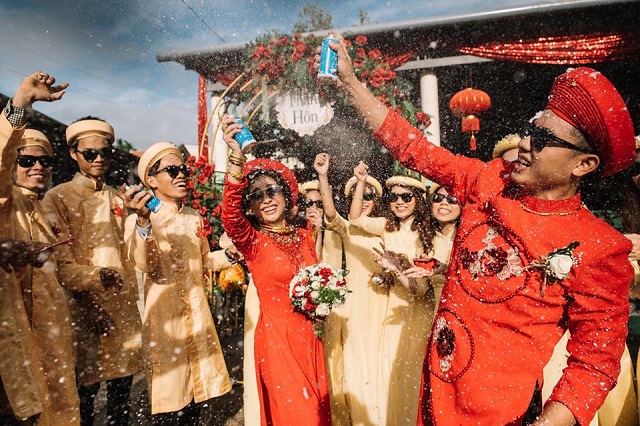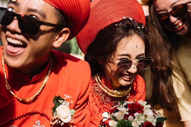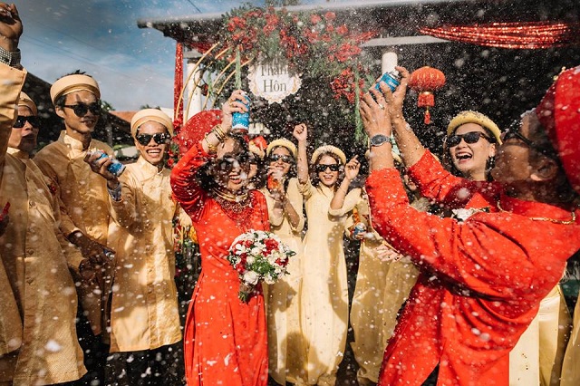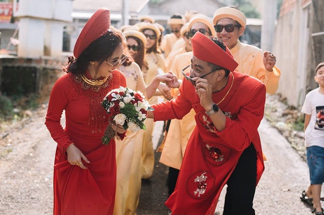 Mới đây, hình ảnh trong lễ cưới của một cặp đôi xứ Huế đã nhận được sự yêu thích của rất nhiều người. Khác với những nghi thức nghiêm trang vốn có của ngày cưới, cô dâu – chú rể và đội quân bê lễ lại có cách thể hiện khá hài hước, thú vị. Vẫn trong trang phục áo dài truyền thống, thế nhưng nguyên dàn bê lễ và “hai nhân vật chính” lại... đeo kính đen. Sự thoải mái, phong cách tươi vui của cặp đôi này khiến ai ngắm nhìn cũng phải bật cười thích thú.