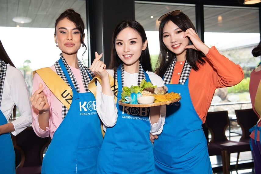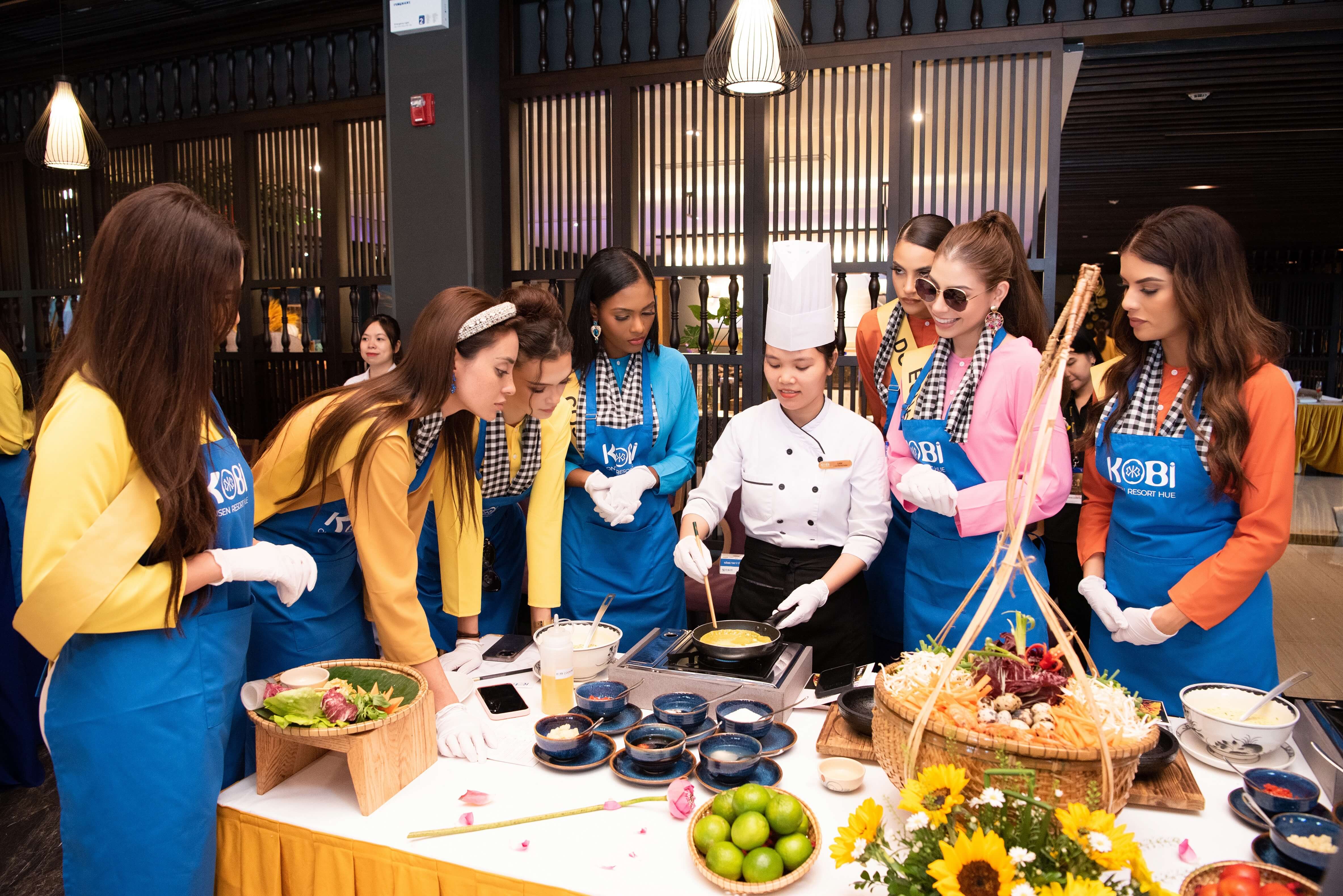 Tại đây, các thí sinh đã được hướng dẫn thực hiện món bánh xèo tôm, thịt đặc trưng của miền Trung. Các hoa hậu còn được tự tay thực hiện đặc sản Việt Nam. Họ thích thú khi nghe về nguồn gốc của tên gọi “Bánh xèo”. Ảnh: BTC.