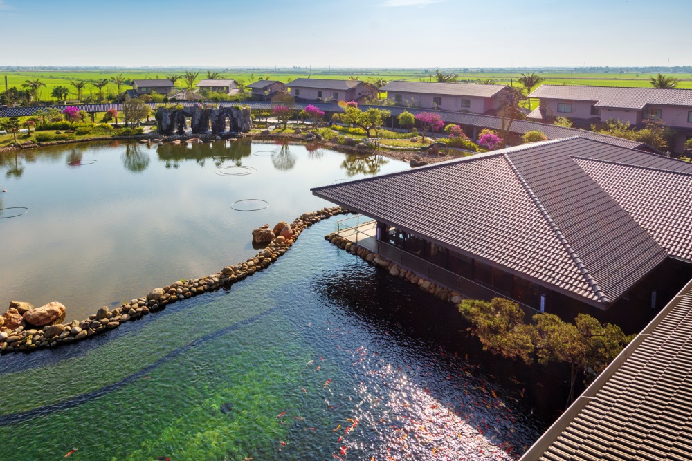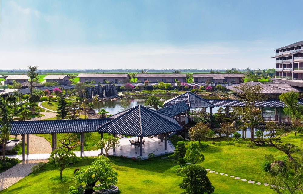 Những lối đi xanh tươi với nhiều loài hoa bốn mùa khoe sắc, những con đường nhỏ bao quanh khu nghỉ dưỡng là không gian thư thái để phóng tầm mắt giữa làn nước trong veo, nơi có đàn cá Koi bơi lội (tại hồ cá Koi được xem là có quy mô lớn tại miền Trung với gần 1.000 cá thể). Đâu đó là bóng tùng, thông la hán - những loài cây cảnh đặc trưng xứ phù tang… Tất cả như đưa du khách hòa mình vào thiên nhiên cây cỏ, cảm nhận luồng không khí trong lành, khoáng đạt để gạt bỏ xô bồ, ồn ào của cuộc sống bên ngoài. Tại đây, mỗi vị khách ghé chân đều được trở về với thiên nhiên và tận hưởng sự an bình bên trong không gian thư thái trọn vẹn.