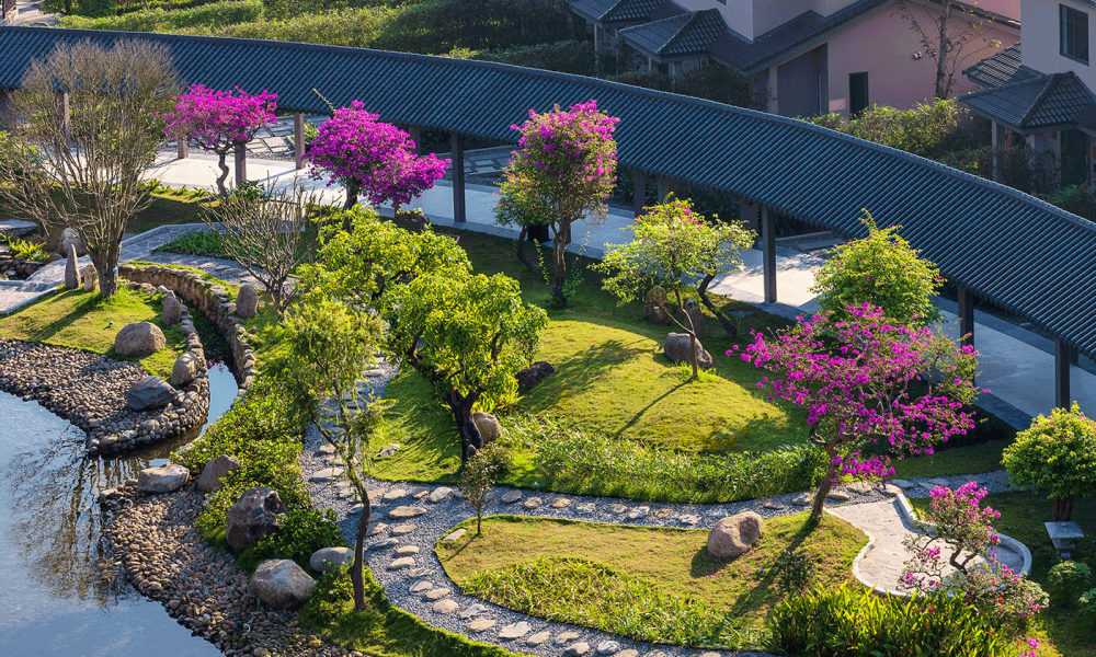Chủ đầu tư khu nghỉ dưỡng này đã quyết định kiến tạo nên những sân vườn mang đậm tinh hoa đặc trưng từ Nhật Bản, điển hình là cảm hứng sân vườn truyền thống theo phong cách Tsukiyama (Trúc Sơn) và vườn cảnh Karesansui, hay còn gọi là sân vườn thiền định (Zen garden).