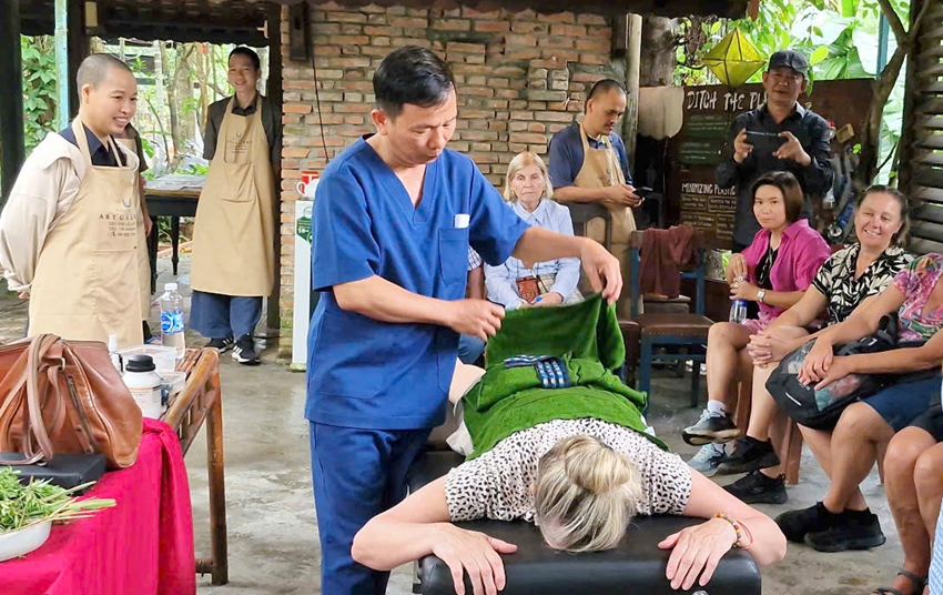 Cùng du khách đến nhiều điểm du lịch tại phường Thủy Biều (quận Thuận Hóa, thành phố Huế) và xã Dương Hòa (thị xã Hương Thủy)…, chúng tôi được nghe giới thiệu về mô hình du lịch gắn với hoạt động CSSK, đặc biệt là ngâm chân bằng cây dược liệu, sử dụng thực phẩm thực dưỡng… Ông Trần Quang Hào, Giám đốc Công ty CP&DV Du lịch HueTourist cho biết, hiện nay, tại Thủy Biều đã hình thành mô hình phát triển các sản phẩm dược liệu theo chuỗi giá trị gắn với du lịch sinh thái. Đây được xem là hướng đi khai thác yếu tố CSSK - một xu hướng du lịch mà du khách rất ưa thích.