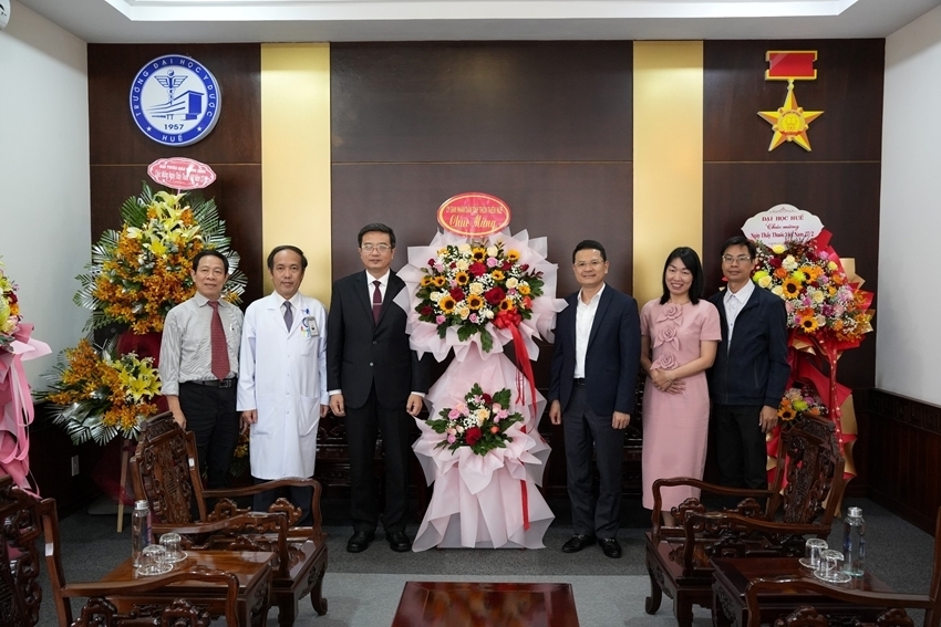 Thượng tá Phan Thắng tặng hoa chúc mừng lãnh đạoTrường đại học Y Dược Huế
