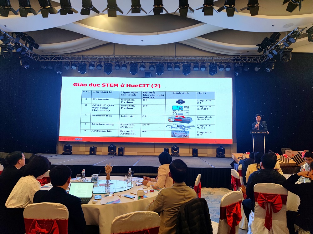 Là đơn vị đồng tổ chức Hội thảo, Trung tâm CNTT Thành phố Huế giới thiệu đến các đại biểu tham luận về Giáo dục STEM hướng công nghệ - một trong những mô hình đang được triển khai vận hành tại HueCIT nhằm hỗ trợ hoạt động giáo dục, giới thiệu về một phương pháp giáo dục tích hợp giúp học sinh phát triển tư duy logic, sáng tạo và kỹ năng giải quyết vấn đề. Theo TS. Đỗ Xuân Huyền, Trưởng phòng phòng Đào tạo và Bồi dưỡng, HueCIT cho biết: STEM là phương pháp giáo dục nâng cao rèn luyện kỹ năng liên quan đến 4 yếu tố: khoa học, công nghệ, kỹ thuật, toán học. Trong thời đại 4.0, các em học sinh có nhiều cơ hội để tiếp cận với tri thức dưới nhiều hình thức, với mô hình giáo dục STEM đang được triển khai tại HueCIT được trang bị hệ thống máy móc, trang thiết bị giáo dục hiện đại, trực quan, đồng bộ, giúp học sinh tiếp cận kiến thức thực tiễn và có thể áp dụng vào đời sống; kích thích tư duy phản biện, sáng tạo và làm việc nhóm; đồng thời đáp ứng được nhu cầu nhân lực chất lượng cao trong thời đại số.