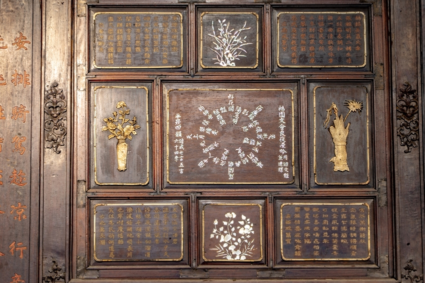 Thơ văn được khảm cẩn ngà voi và xương ở nội thất điện Long An (Ảnh: Trung tâm BTDT)