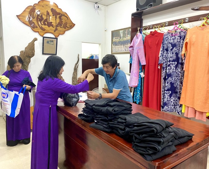 Anh Nguyễn Quốc Hòa và khách hàng may áo dài.
