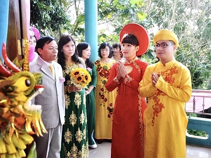 Anh Dương Quang Trí cho biết, trong ngày cưới, hai vợ chồng anh không chọn veston mà quyết định chọn áo dài, khăn đóng xứ Huế. Vì bộ trang phục này mang vẻ đẹp truyền thống của cha ông để lại.