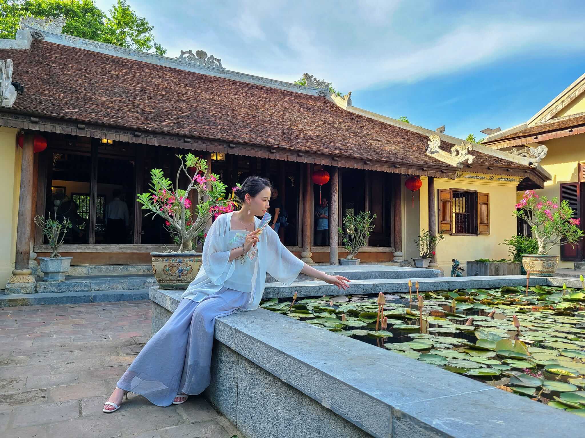 - Tiếp theo là Làng Hương. Mình ghé tiệm hương cô Hoa có anh con trai chụp cực đỉnh ạ. 3s có ngay bức ảnh đẹp. Vào đây chụp miễn phí, có cho thuê đồ cổ trang nữa nhưng hôm ý nóng với hơi đông nên mình ko thuê. Bù lại mua 2 que kem ủng hộ quán cô.