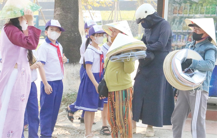Khách vừa gửi xe ở bãi xe gần Đại Nội, những người bán hàng đã tới mời mua mũ nón