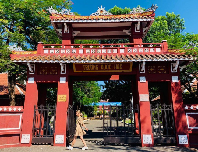 Những địa điểm du lịch miễn phí ở Huế -Trường Quốc Học Huế sở hữu một loạt góc sống ảo đẹo vi diệu, thu hút nhiều khách du lịch bởi vẻ đẹp có kết hợp giữa nét cổ kính của những tòa nhà kiến trúc kiểu Pháp với nét lãng mạng nên thơ của những khoảng sân trường rợp bóng cây.