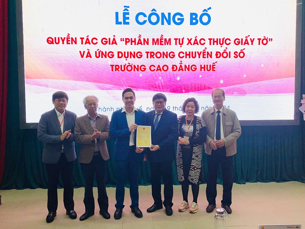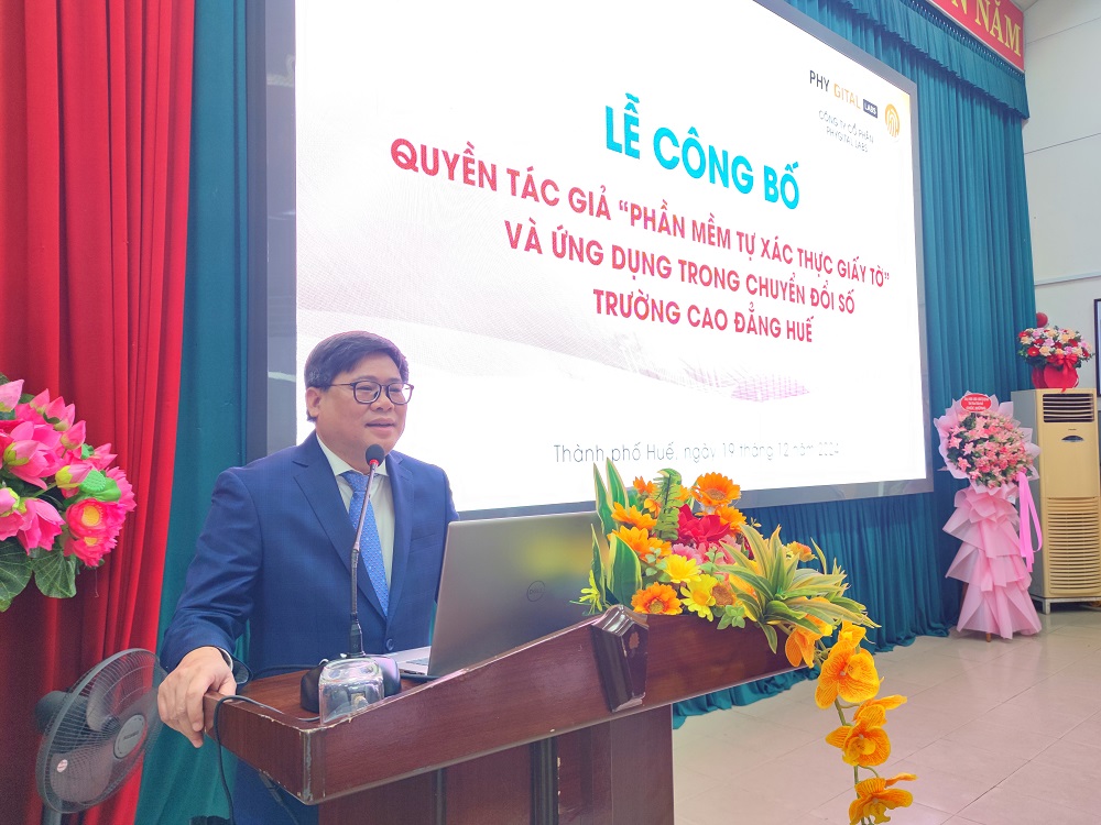 Sáng ngày 19/12, tại cơ sở 82 Hùng Vương, thành phố Huế, Trường Cao đẳng Huế phối hợp với Công ty Cổ phần Phygital Labs tổ chức Lễ công bố Quyền tác giả “Phần mềm tự xác thực giấy tờ” và Ứng dụng trong Chuyển đổi số Trường Cao đẳng Huế.