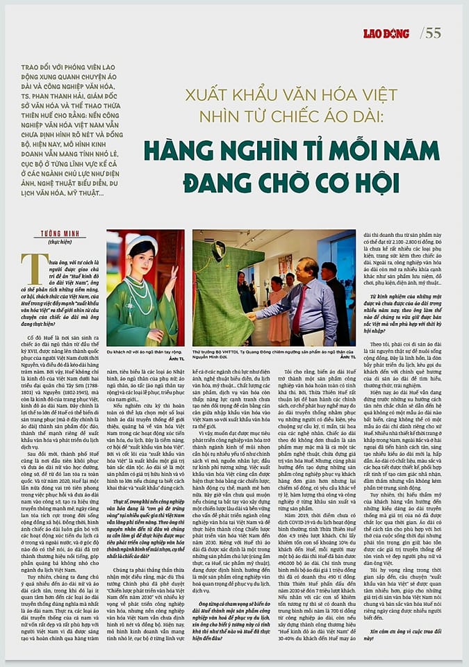 PTH: Chúng ta phải thẳng thắn thừa nhận một điều rằng, mặc dù Thủ tướng Chính phủ đã phê duyệt “Chiến lược phát triển văn hóa Việt Nam đến năm 2030” với nhiều kỳ vọng về phát triển công nghiệp văn hóa, nhưng nền công nghiệp văn hóa Việt Nam vẫn chưa định hình rõ nét và đồng bộ. Hiện nay, mô hình kinh doanh vẫn mang tính nhỏ lẻ, cục bộ ở từng lĩnh vực kể cả ở các ngành chủ lực như điện ảnh, nghệ thuật biểu diễn, du lịch văn hóa, mỹ thuật... Chất lượng các sản phẩm, dịch vụ văn hóa còn thấp; năng lực cạnh tranh chưa tạo nên đối trọng để cân bằng cán cân giữa nhập khẩu văn hóa vào Việt Nam so với xuất khẩu văn hóa ra thế giới. Vì vậy, muốn đạt được mục tiêu phát triển công nghiệp văn hóa trở thành ngành kinh tế mũi nhọn cần hội tụ nhiều yếu tố như chính sách vĩ mô, nguồn nhân lực, đầu tư kinh phí tương xứng. Việc xuất khẩu văn hóa Việt cũng cần được hiện thực hóa bằng các chiến lược, hành động cụ thể, mạnh mẽ hơn nữa. Bây giờ vẫn chưa quá muộn nếu chúng ta bắt tay vào xây dựng một chiến lược lâu dài và bền vững cho vấn đề phát triển ngành công nghiệp văn hóa tại Việt Nam và để thực hiện thành công Chiến lược phát triển văn hóa Việt Nam đến năm 2030. Riêng với Huế thì áo dài đã được xác định là một trong những sản phẩm chủ lực (cùng ẩm thực, ca Huế, tác phẩm mỹ thuật), đang được định hình, hướng đến là một sản phẩm công nghiệp văn hoá quan trọng để phục vụ du lịch, dịch vụ.