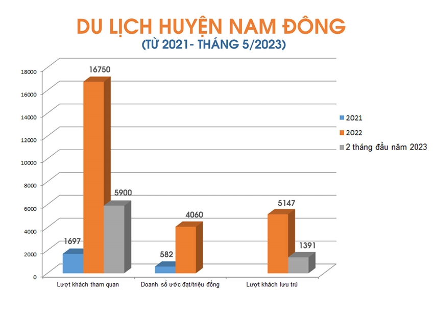 Theo thông tin từ UBND huyện Nam Đông, trong năm 2022, toàn huyện đón 16.750 lượt khách tham quan (5.147 lượt khách lưu trú) với doanh số ước đạt 4.060 triệu đồng (tăng 15.053 lượt khách và 3.478 triệu đồng so với năm 2021). Các hoạt động thương mại, dịch vụ nhà hàng, nhà nghỉ và hoạt động du lịch sinh thái trên địa bàn duy trì ổn định, mô hình homestay bước đầu có sự phát triển, các điểm du lịch thường xuyên thu hút khách trong và ngoài tỉnh đến tham quan hơn.
