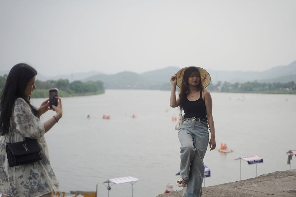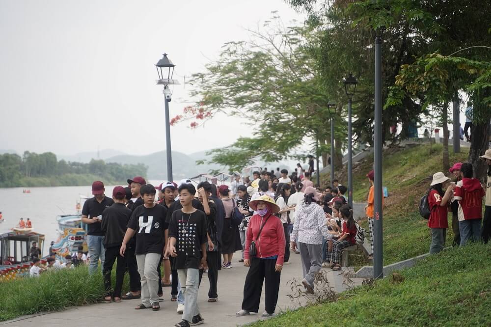 Trời càng về chiều, cũng là lúc rất đông bạn trẻ tìm đến bên bờ sông Hương để vui chơi. Ảnh: N.Q.
