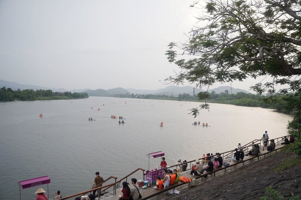 Khung cảnh êm đềm khi hoàng hôn buông xuống dòng sông Hương lúc chiều tà đã thu hút nhiều người dân, du khách đến vui chơi và thư giãn sau một ngày học tập và làm việc mệt mỏi. Ảnh: N.Q.