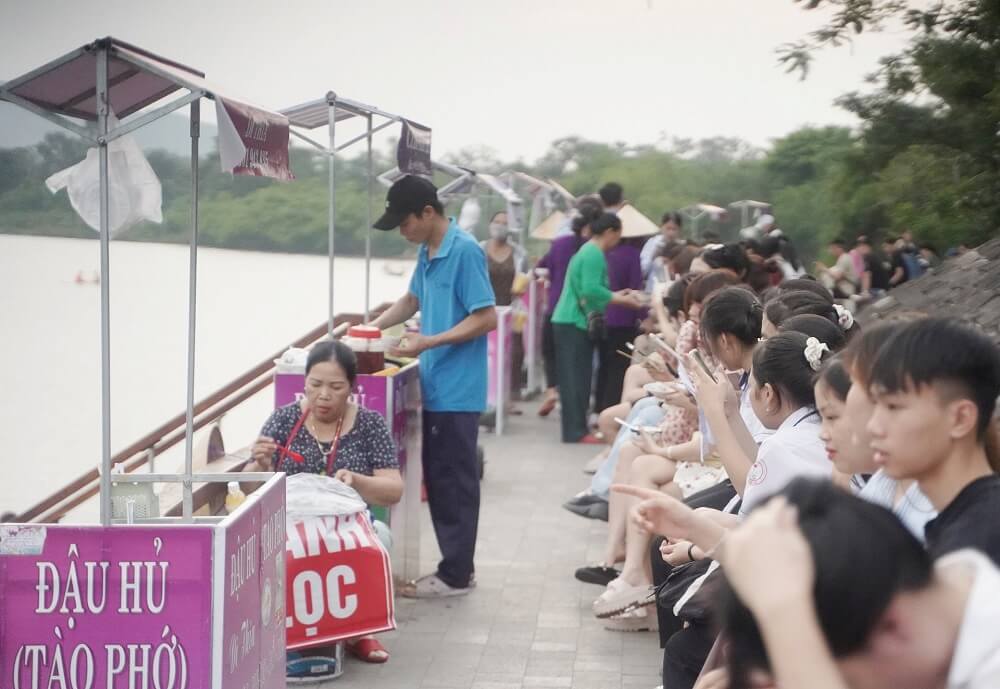 Nhiều bạn trẻ thích thú khi ngắm hoàng hôn và dùng đậu hủ bên dòng sông Hương thơ mộng. Ảnh: N.Q.