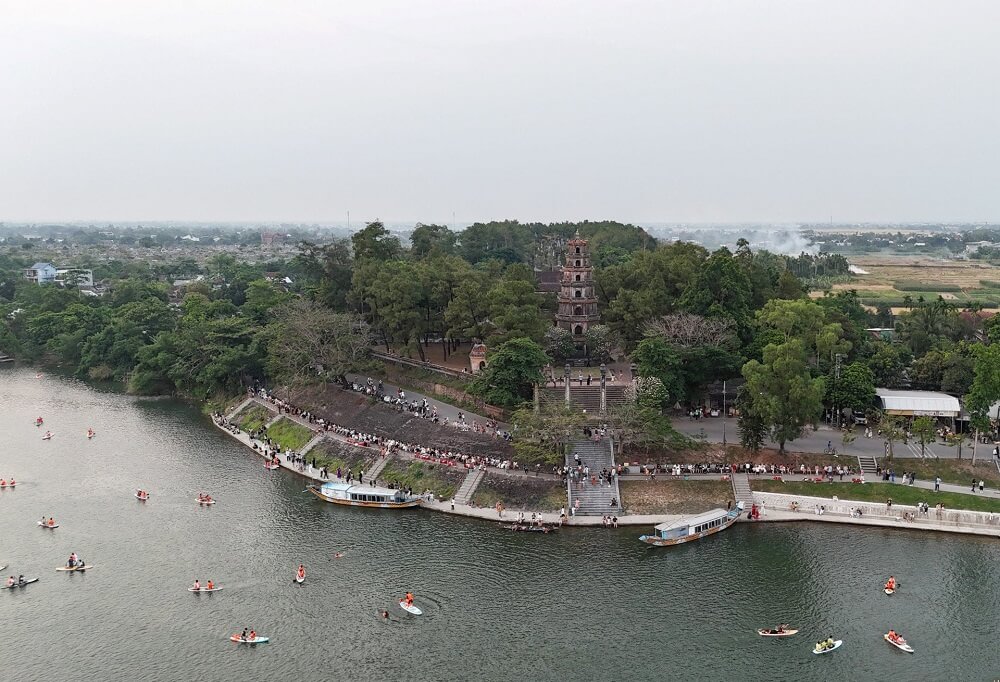 Với mong muốn tạo ra một không gian mới để người dân và du khách có thể dạo bước ngắm dòng sông Hương thơ mộng, những năm gần đây, chính quyền thành phố Huế tiến hành chỉnh trang cảnh quan dọc hai bên bờ sông, trong đó, có không gian phía trước chùa Thiên Mụ, để nơi đây trở thành một địa điểm lý tưởng, thu hút đông đảo người dân, du khách đến tham quan. Ảnh: N.Q.