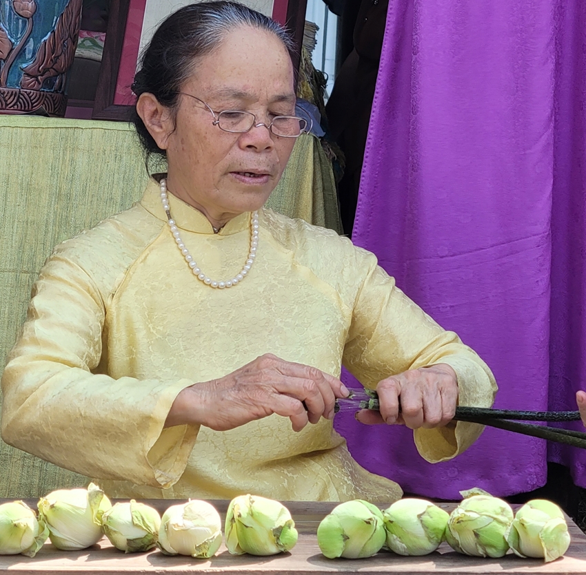 Nghệ nhân Phan Thị Thuận giới thiệu sản phẩm làm từ tơ sen