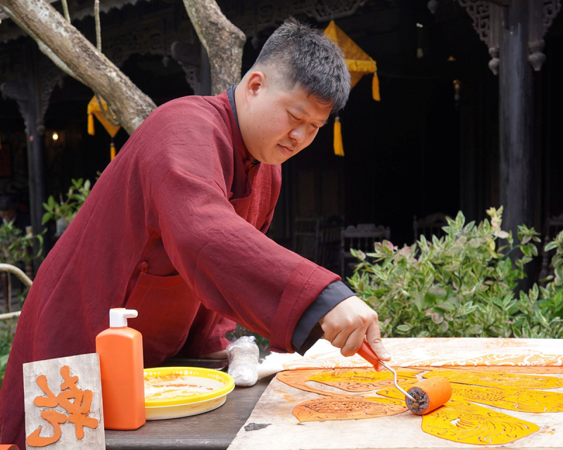 Người thợ cần mẫn thực hiện công đoạn để tạo ra bộ tranh liễn làng Chuồn.