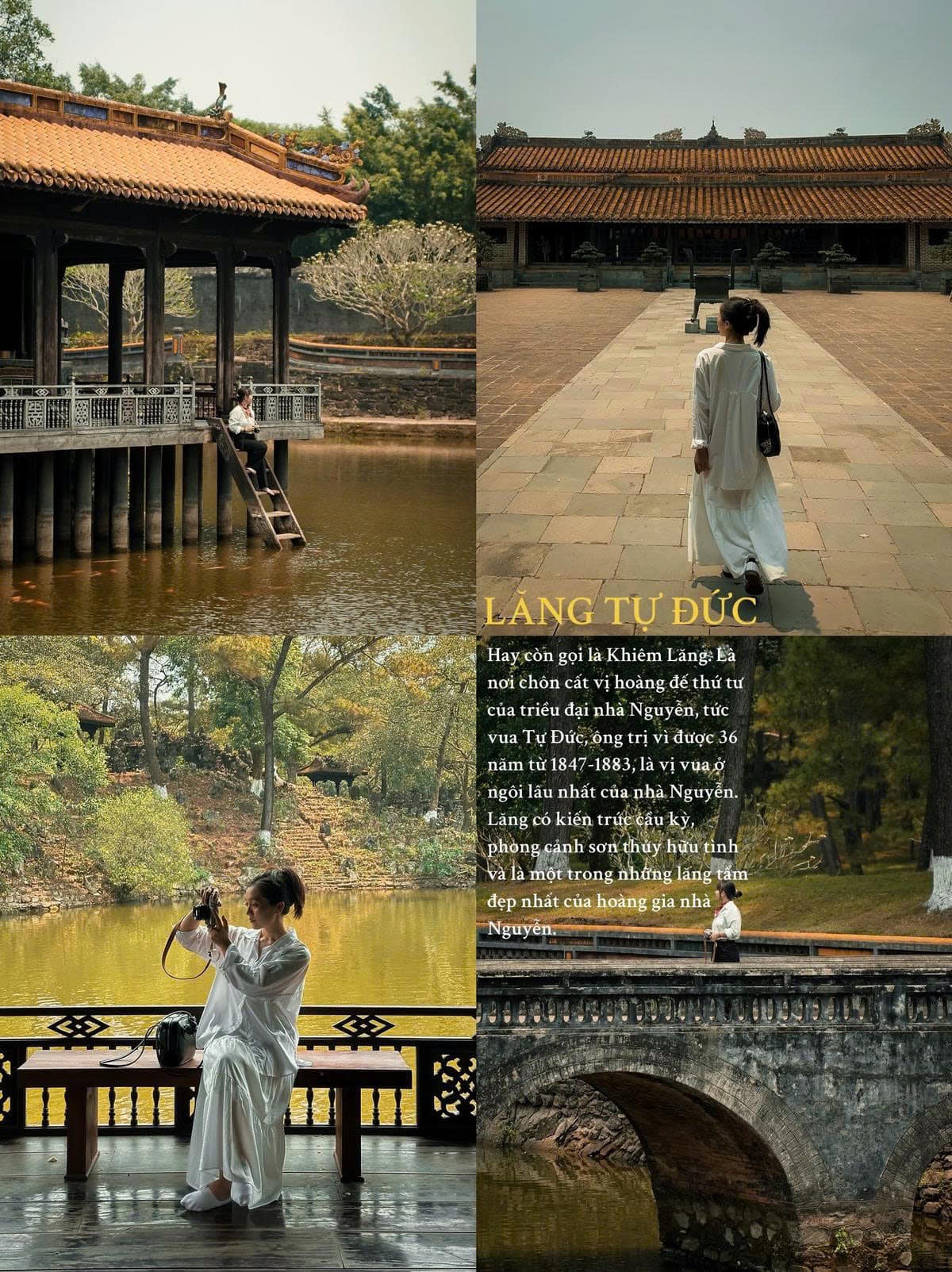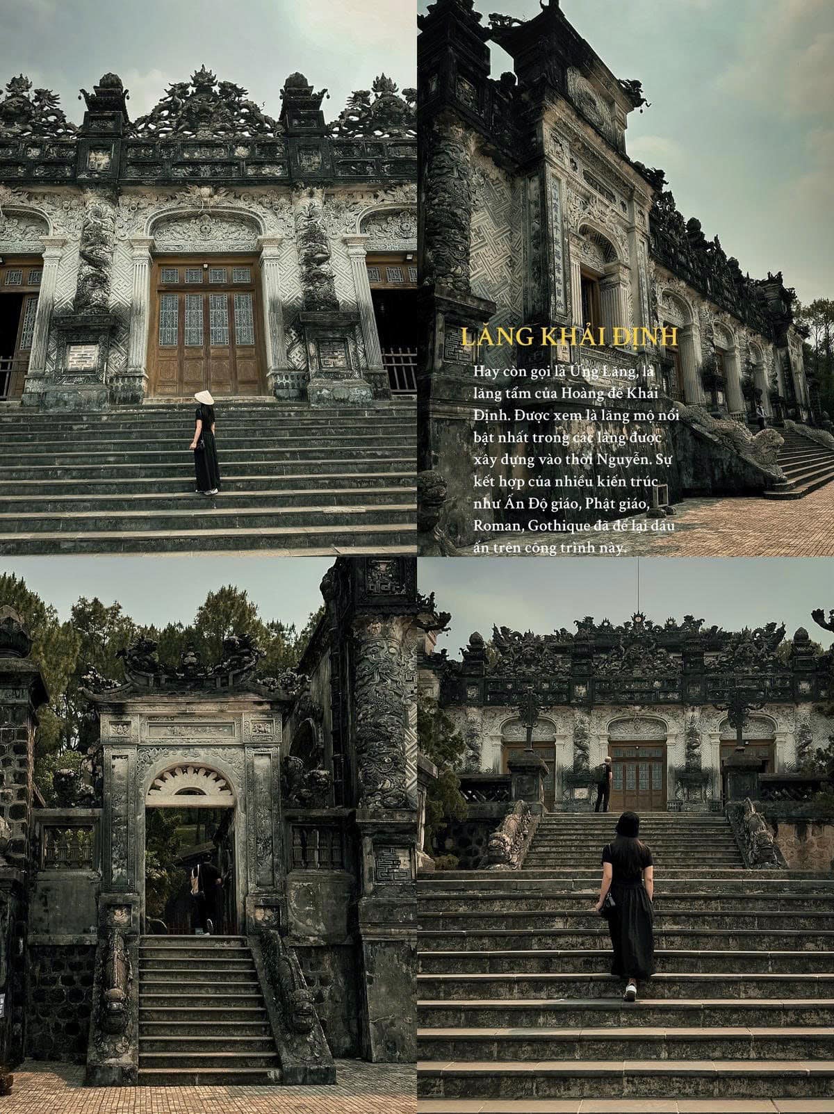Tiếp tục hành trình, hãy ghé thăm Lăng Khải Định – một công trình kết hợp tinh tế giữa kiến trúc Việt và phong cách phương Tây. Với lối trang trí cầu kỳ, tinh xảo, Lăng Khải Định nổi bật với các chi tiết ghép sành sứ rực rỡ và tượng đá chạm khắc tinh xảo. Đây là nơi lý tưởng để bạn lưu lại những bức ảnh độc đáo bởi sự kết hợp hài hòa giữa kiến trúc cổ điển và khung cảnh thiên nhiên hùng vĩ.