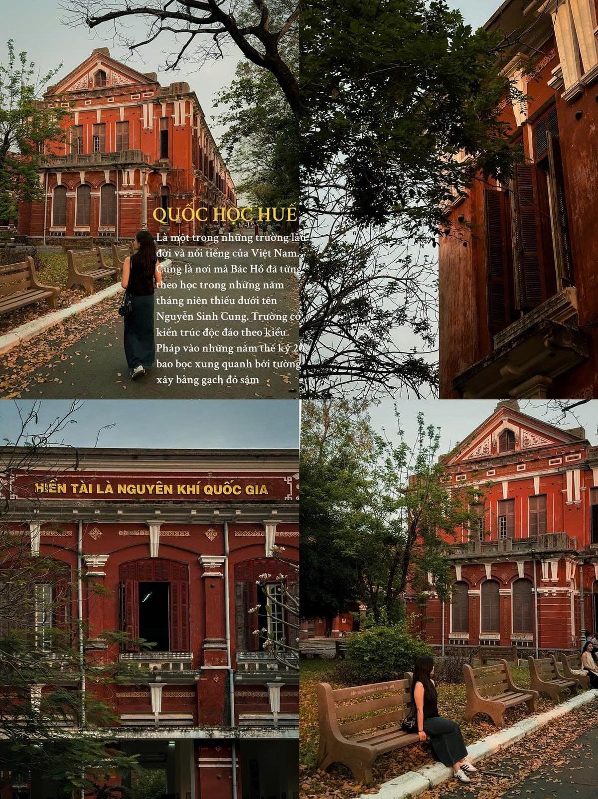 Nổi tiếng với bề dày lịch sử hơn 120 năm, Trường Quốc Học Huế không chỉ là nơi đào tạo nhiều nhân tài của đất nước mà còn nổi bật với kiến trúc Pháp cổ kính. Những hàng cây xanh mát và sắc đỏ của tường gạch tạo nên khung cảnh lãng mạn, rất thích hợp để bạn chụp ảnh kỷ niệm.