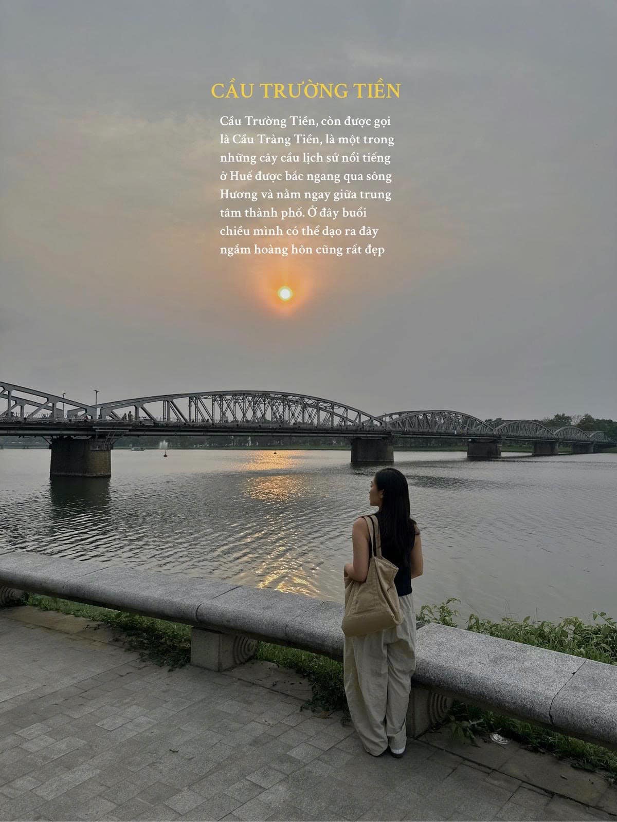Được xem là biểu tượng của Huế, Cầu Trường Tiền lung linh dưới ánh đèn màu sắc vào buổi tối, tạo nên khung cảnh nên thơ bên dòng sông Hương. Bạn có thể dạo bộ trên cầu hoặc ngồi thuyền rồng ngắm cảnh sông nước, lắng nghe những giai điệu nhã nhạc cung đình.