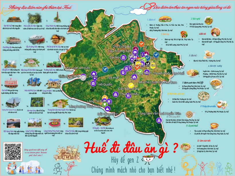 Trong bản đồ có tích hợp các điểm đến và gợi ý các địa điểm ẩm thực tại TP Huế, ngoài ra còn có mã QR để du khách có thể quét để biết thêm nhiều thông tin mà bản đồ cung cấp.