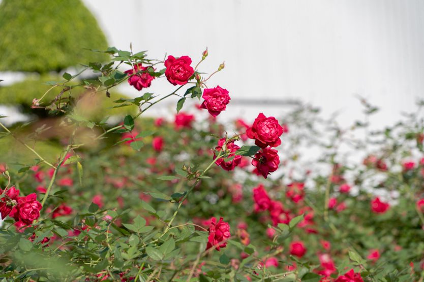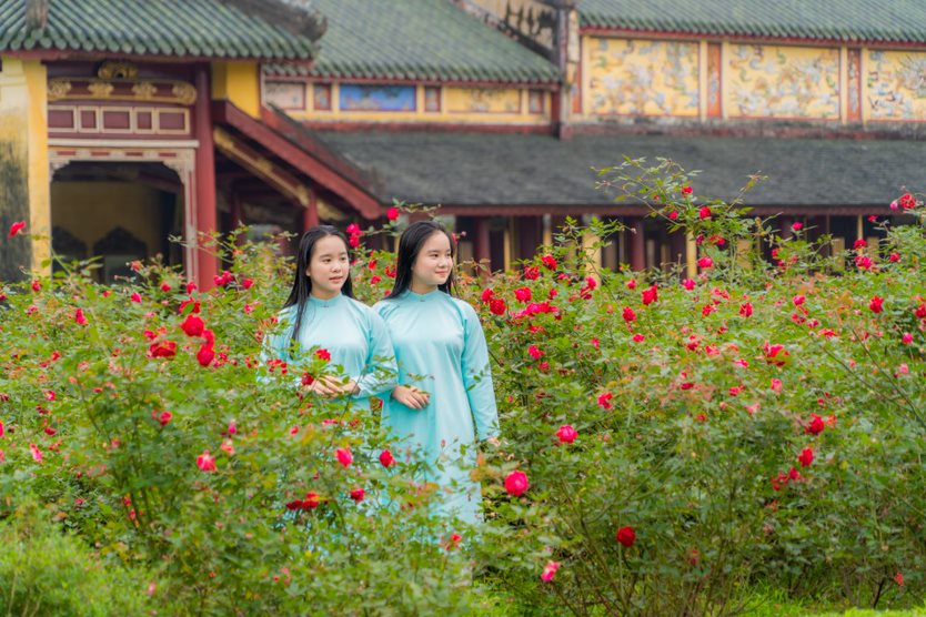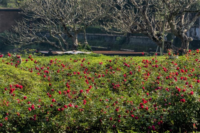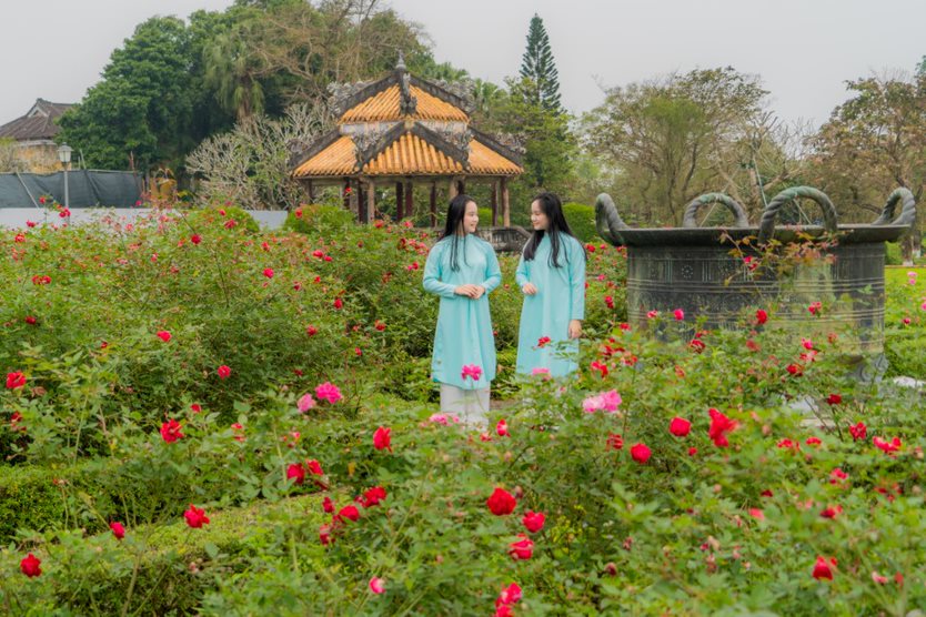 Trước Điện Kiến Trung nguy nga, tráng lệ đang gần hoàn thiện là bãi sân rộng với bát giác đình và đài nước cổ, tất cả đều mang kiến trúc châu Âu rõ nét. Con người xứ Di Sản đã khéo sắp đặt, ươm trồng vào khoảng sân đó là cả vườn hồng có tên là Louis Philippe (còn gọi là King of France) hay hồng cổ Huế, là một giống hoa hồng cổ cho hoa màu đỏ rất rực rỡ, cây rất sai hoa, mùi hương dễ chịu, xuất hiện lần đầu năm 1834, chu kỳ nở 40 ngày, cánh hoa đỏ đậm ở ngoài và có màu hồng sáng ở giữa, hương thơm ngọt và được sử dụng trong sản phẩm nước khoáng hoa hồng và dầu hoa hồng của SunMountain Laboratory để tăng note “sweety”.