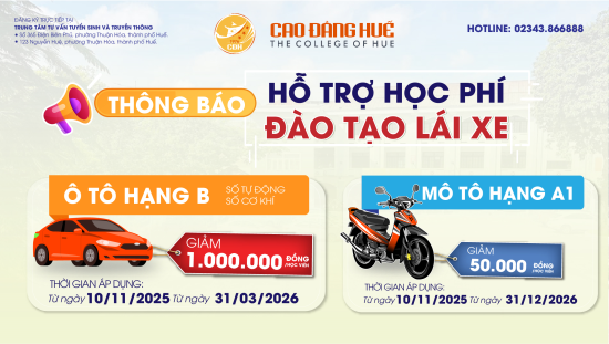 Trước ảnh hưởng nặng nề của đợt mưa lũ lịch sử vừa qua tại thành phố Huế và khu vực miền Trung, nhằm chia sẻ khó khăn với người dân và học viên, Trường Cao đẳng Huế triển khai chính sách hỗ trợ học phí đặc biệt dành cho học viên đăng ký học lái xe ô tô hạng B và hạng A1.
