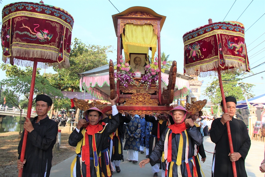 Nghi thức lễ rước hoa sen, chân dung Chủ tịch Hồ Chí Minh từ đình làng đến Nhà lưu niệm thời niên thiếu của Chủ tịch Hồ Chí Minh ở làng Dương Nỗ