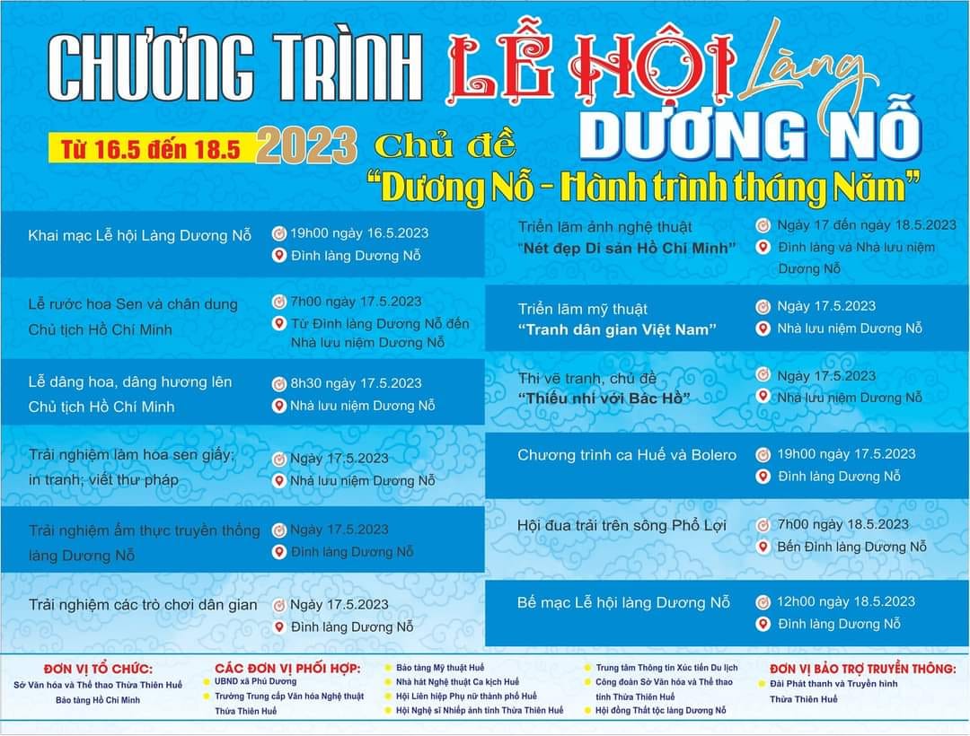 Hoạt động nhằm thiết thực chào mừng kỷ niệm 133 năm Ngày sinh Chủ tịch Hồ Chí Minh (19/5/1890-19/5/2023). Đình làng Dương Nỗ được biết đến là Di tích lịch sử cấp quốc gia đặc biệt, là một di tích tiêu biểu trong hệ thống di tích lưu niệm về thời niên thiếu của Chủ tịch Hồ Chí Minh tại Thừa Thiên Huế, đặc biệt là trong thời gian Người cùng anh theo cha về sinh sống, học tập tại làng Dương Nỗ (giai đoạn 1898 - 1900).