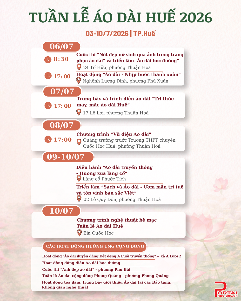 - • Chương trình nghệ thuật bế mạc sẽ diễn ra vào ngày 10/7 tại khu vực Bia Quốc Học, khép lại tuần lễ bằng những tiết mục đặc sắc.
