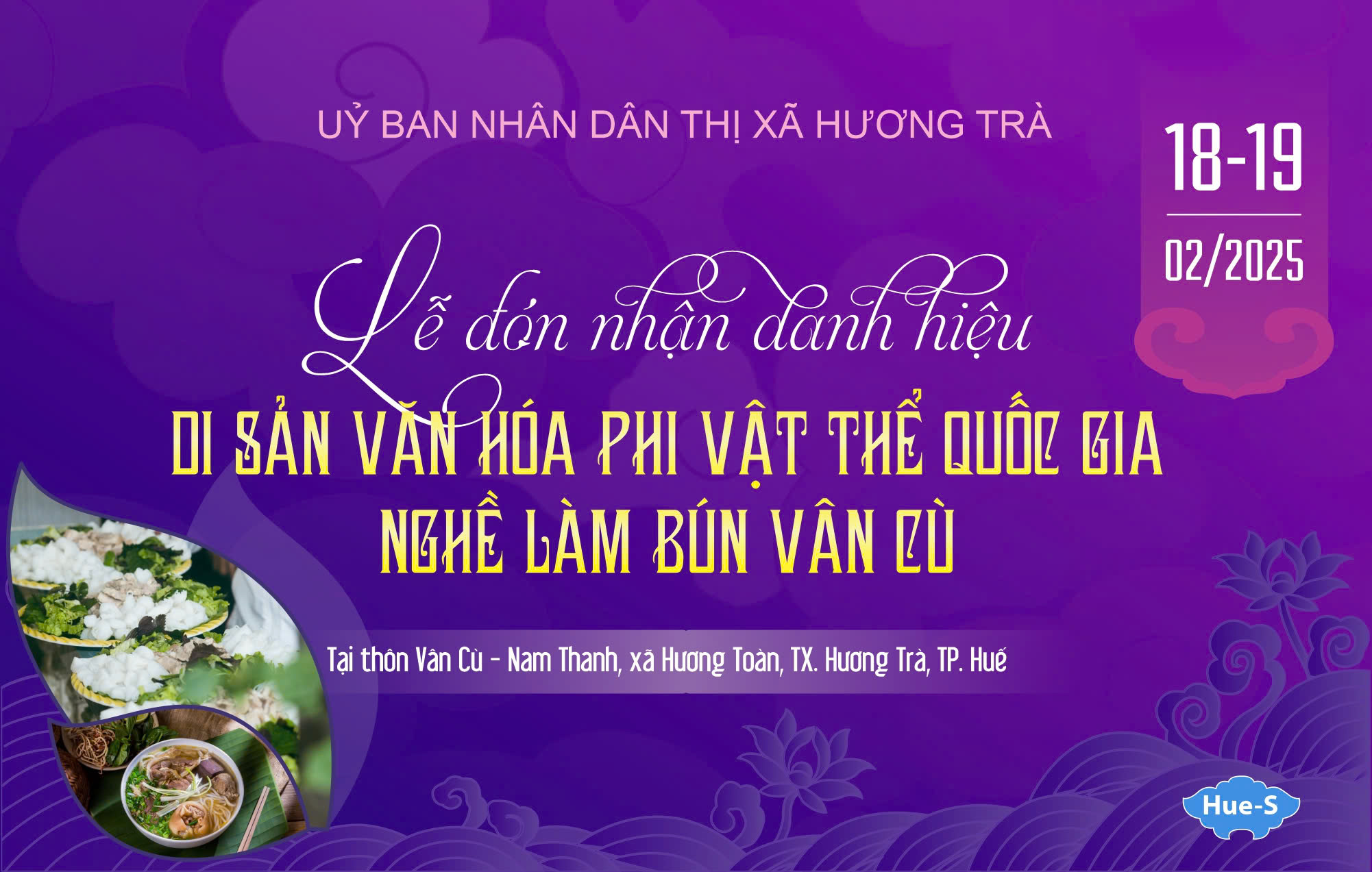 Căn cứ Quyết định số 3979/QĐ-BVHTTDL ngày 10 tháng 12 năm 2024 của Bộ Văn hóa, Thể thao và Du lịch về việc công bố Danh mục di sản văn hóa phi vật thể quốc gia, nghề thủ công truyền thống “Nghề làm Bún Vân Cù” được đưa vào danh mục di sản văn hóa phi vật thể quốc gia; Thực hiện Công văn số 194/UBND-CN, ngày 07 tháng 01 năm 2025 của Ủy ban nhân dân thành phố Huế về việc tổ chức Lễ đón nhận danh hiệu Di sản Văn hóa phi vật thể Quốc gia Nghề làm bún Vân Cù, ngày 22/01/2025 Ủy ban nhân dân thị xã Hương Trà đã ban hành Kế hoạch số 324/KH-UBND tổ chức Lễ đón nhận danh hiệu Di sản văn hóa Phi vật thể quốc gia: Nghề làm bún Vân Cù.