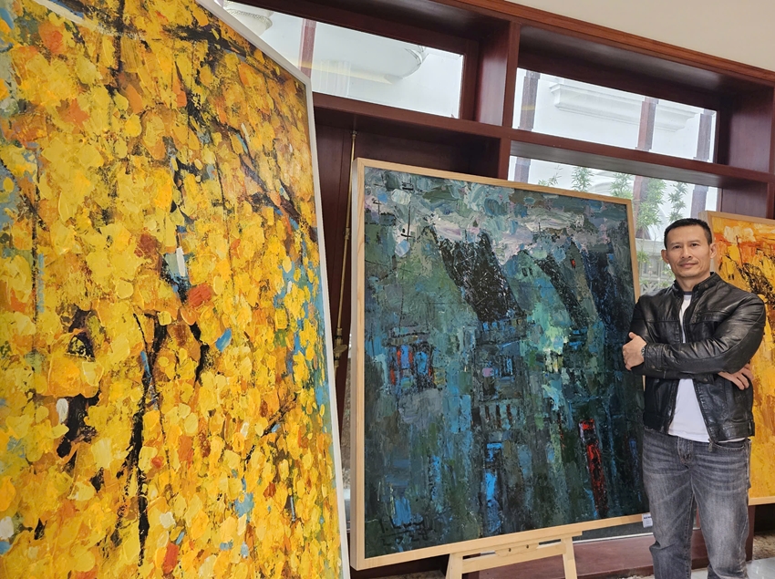 Lê Anh Huy bên những tác phẩm ở triển lãm cá nhân đầu tiên của chính mình