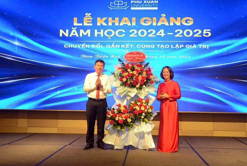 Lãnh đạo Sở Giáo dục và Đào tạo tặng hoa chúc mừng Trường đại học Phú Xuân tại lễ khai giảng