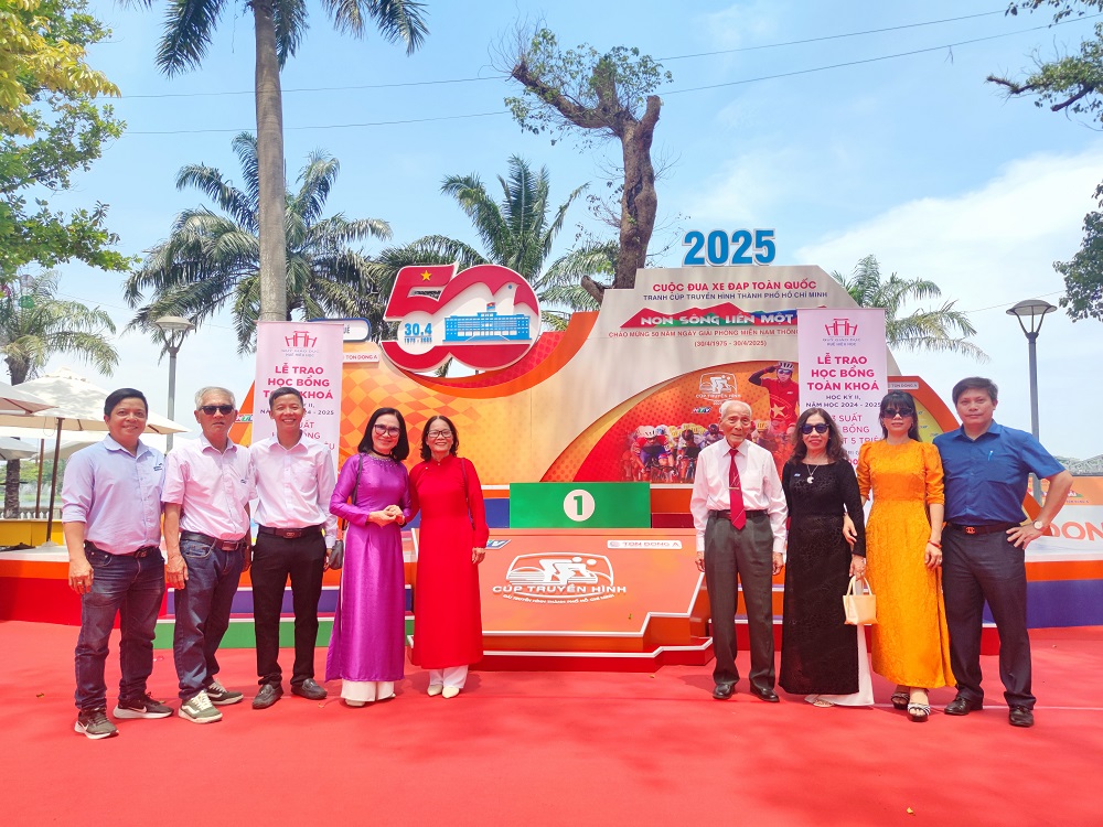 Các đại biểu chụp hình lưu niệm cùng Ban đại diện Quỹ Giáo dục Huế Hiếu Học và các sinh viên nhận học bổng toàn khóa Học kỳ II năm học 2024 - 2025