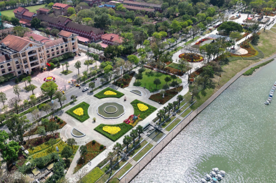 Công viên hai bờ sông Hương được trang trí nhiều loài hoa cùng linh vật đón Tết Bính Ngọ, nổi bật là cặp ngựa xanh - đỏ tượng trưng âm dương hài hòa.
