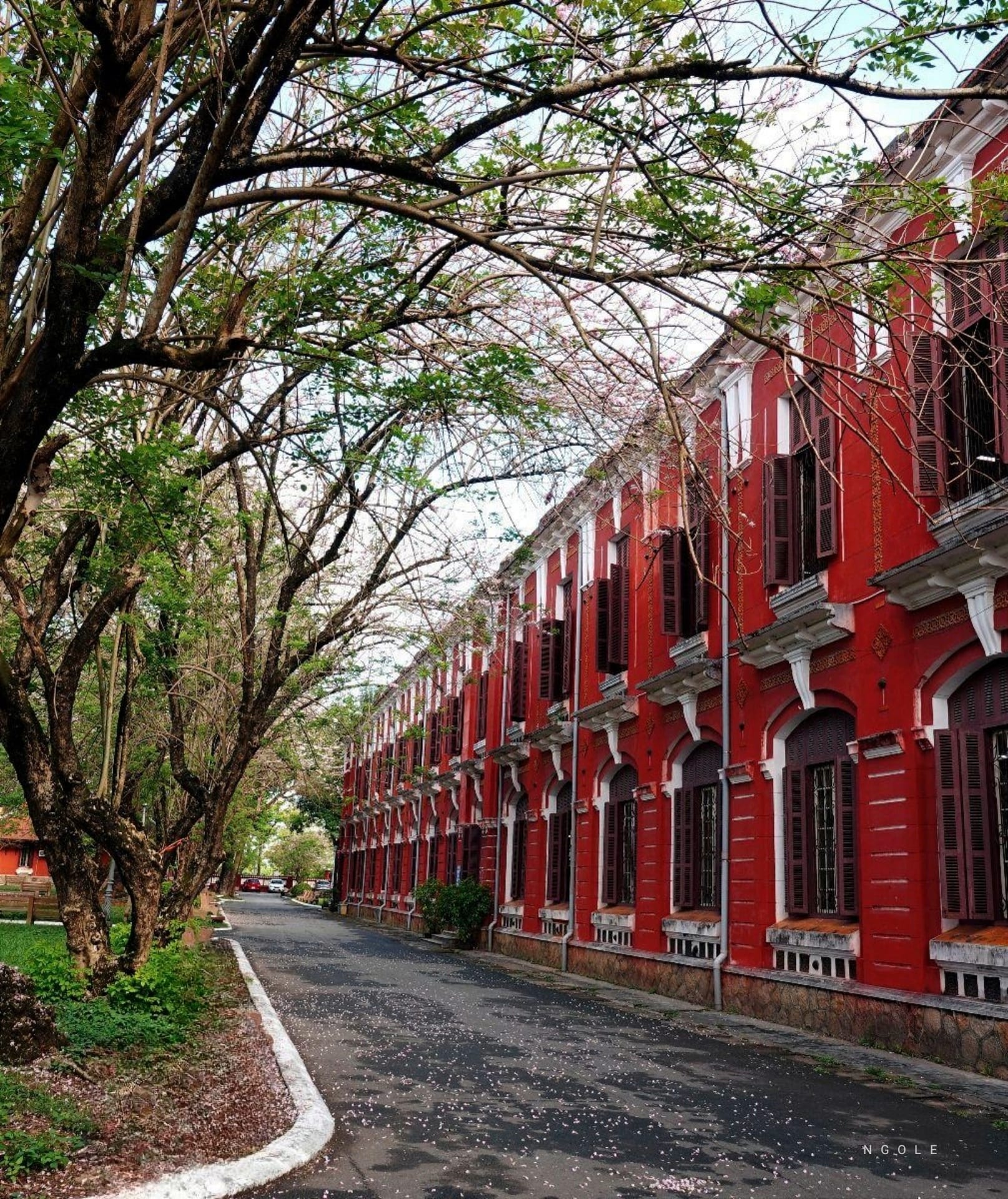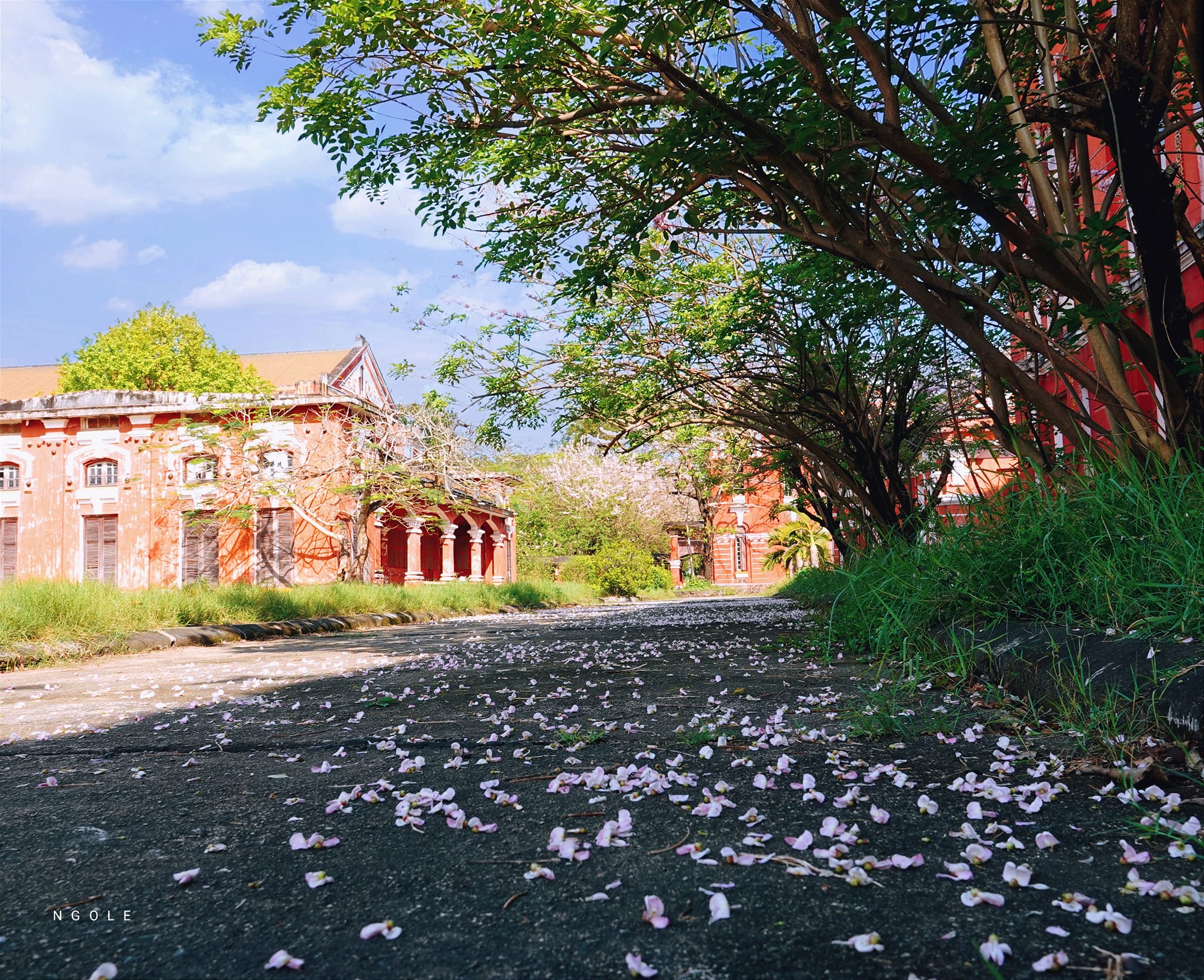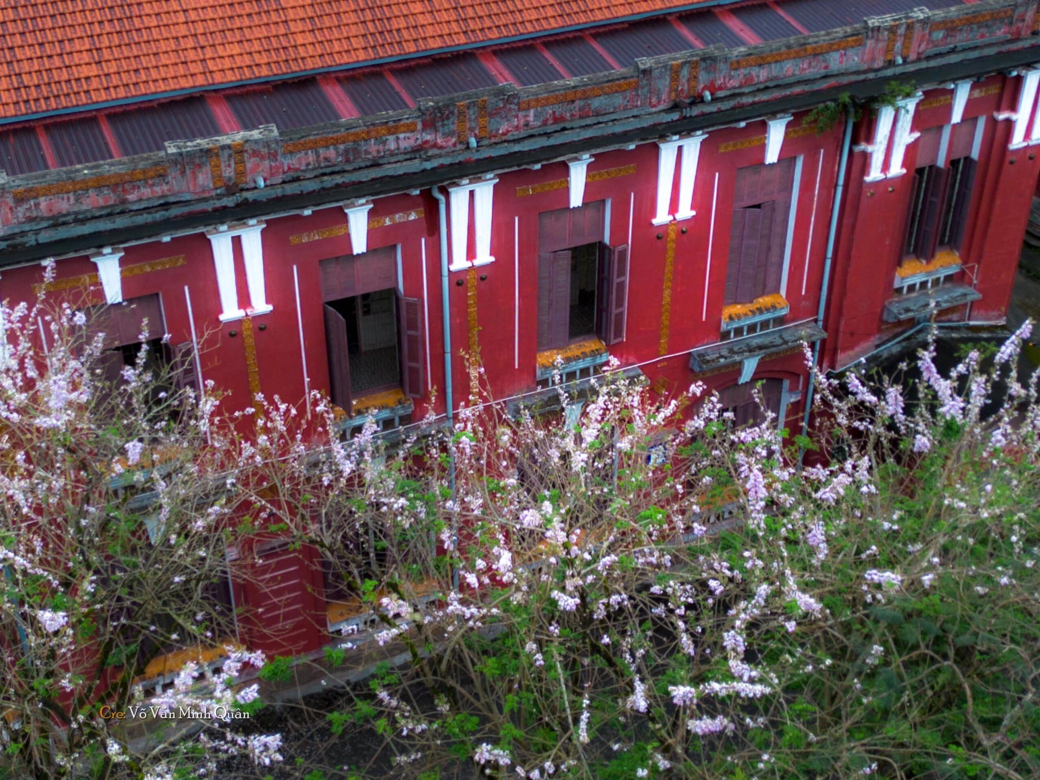 Ngôi trường Chuyên Quốc Học Huế cổ kính với ngói đỏ rêu phong, bao quanh là màu xanh mơn mởn của lá và sắc hồng tươi non của những chùm điệp anh đào khoe sắc thật đẹp!