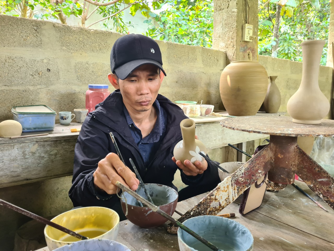 Một nghệ nhân vẽ trang trí lên gốm Phước Tích