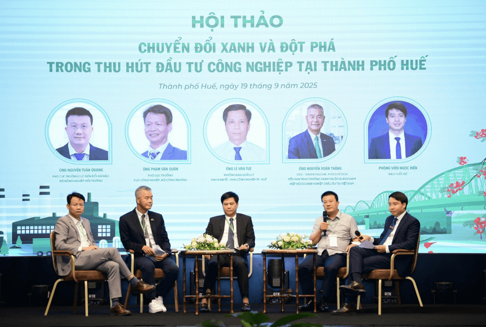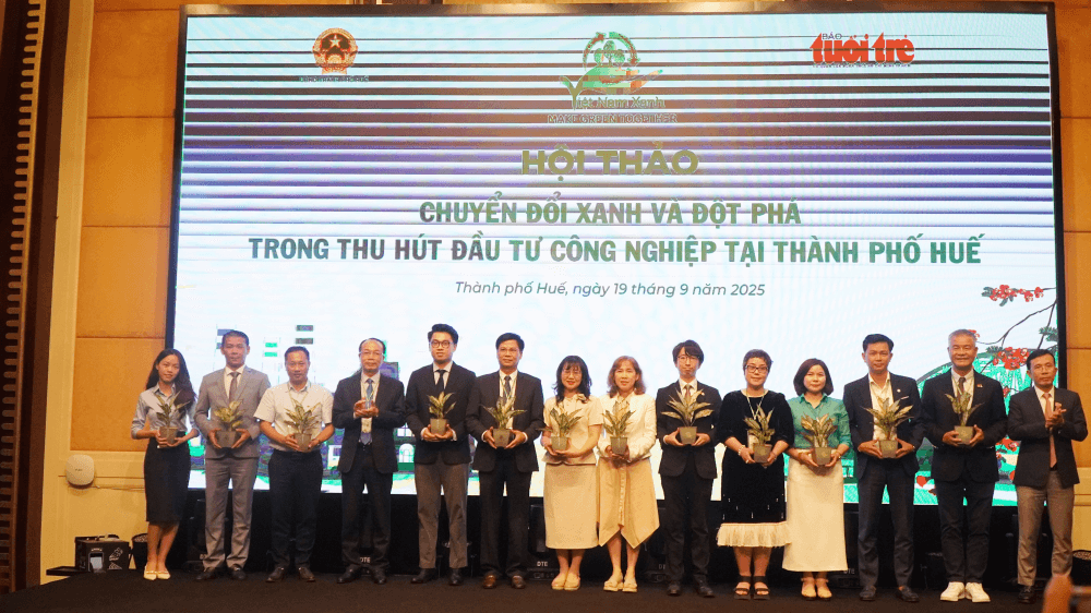 Chiều 19/9, tại Khách sạn Indochine Palace, TP. Huế, diễn ra Hội thảo “Chuyển đổi Xanh và Chiến lược thu hút đầu tư công nghiệp tại TP. Huế” – hoạt động nằm trong khuôn khổ dự án Việt Nam Xanh do Báo Tuổi Trẻ và Liên minh Tái chế Bao bì Việt Nam (PRO Vietnam) phối hợp cùng UBND TP. Huế tổ chức. Hơn 150 đại biểu, gồm lãnh đạo các bộ, ngành, tổ chức quốc tế, chuyên gia kinh tế và đại diện khoảng 30 doanh nghiệp đã tham dự. Hội thảo có sự hiện diện của PGS.TS Trần Đình Thiên – Nguyên Viện trưởng Viện Kinh tế Việt Nam; bà Vương Thị Minh Hiền – Phó Cục trưởng Cục Đầu tư nước ngoài (Bộ Tài chính); ông Nguyễn Tuấn Quang – Phó Cục trưởng Cục Biến đổi khí hậu (Bộ TN&MT); ông Phạm Văn Quân – Phó Cục trưởng Cục Công nghiệp (Bộ Công Thương).