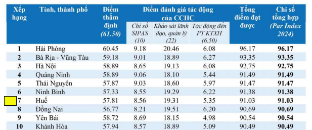 Năm 2024, thành phố Huế tiếp tục cho thấy sự nỗ lực trong cải thiện chỉ số CCHC (PAR Index) khi lọt vào Top 10 cả nước, xếp vị trí thứ 7 (đạt 91,03 điểm), tăng 10 bậc so với năm 2023. Kết quả này cho thấy các hoạt động chỉ đạo, điều hành CCHC ngày càng có những chuyển biến tích cực cả về tư duy, hành động và hiệu quả đạt được trong thực tiễn. Cải cách thủ tục hành chính tại thành phố Huế được triển khai quyết liệt, các mô hình mới được triển khai thí điểm, gắn kết chặt chẽ với chuyển đổi số và Đề án 06 đã mang lại nhiều hiệu quả, lợi ích thiết thực cho người dân, doanh nghiệp. Chỉ số CCHC tiếp tục khẳng định là công cụ quản lý quan trọng, thước đo hiệu quả giúp xác định rõ điểm mạnh, điểm yếu trong thực hiện nhiệm vụ CCHC của từng cơ quan, đơn vị; đồng thời, cá thể hóa trách nhiệm đến từng cá nhân, tổ chức trong thực hiện nhiệm vụ CCHC, góp phần nâng cao hiệu quả lãnh đạo, chỉ đạo, điều hành của người đứng đầu các sở, ngành, địa phương và các cơ quan, đơn vị.