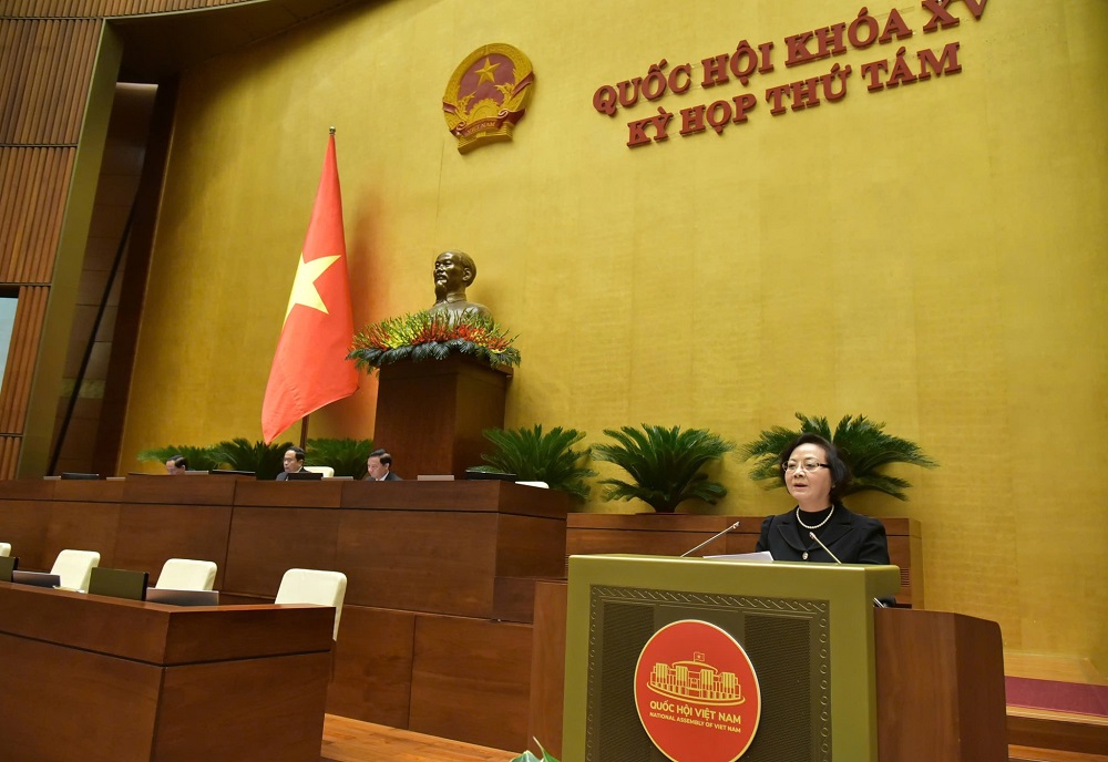 Bộ trưởng Bộ Nội vụ Phạm Thị Thanh Trà trình bày tóm tắt tờ trình Đề án thành lập thành phố Huế trực thuộc Trung ương (nguồn ảnh: Quốc hội)