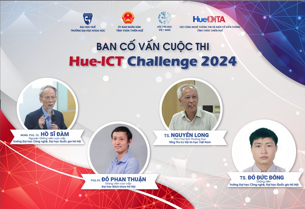 Trong lần tổ chức thứ 3 này, Cuộc thi Hue-ICT Challenge 2024 nhận được sự đồng hành bảo trợ về mặt chuyên môn của Hội Tin học Việt Nam với các chuyên gia hàng đầu: TS. Nguyễn Long, Phó Chủ tịch kiêm Tổng Thư ký Hội Tin học Việt Nam; PGS. TS. Hồ Sĩ Đàm, Nguyên Giảng viên cao cấp, Trường Đại học Công nghệ, Đại học Quốc gia Hà Nội; PGS.TS. Đỗ Phan Thuận, Giảng viên cao cấp, Đại học Bách khoa Hà Nội; TS. Đỗ Đức Đông, Giảng viên Trường Đại học Công nghệ, Đại học Quốc gia Hà Nội.