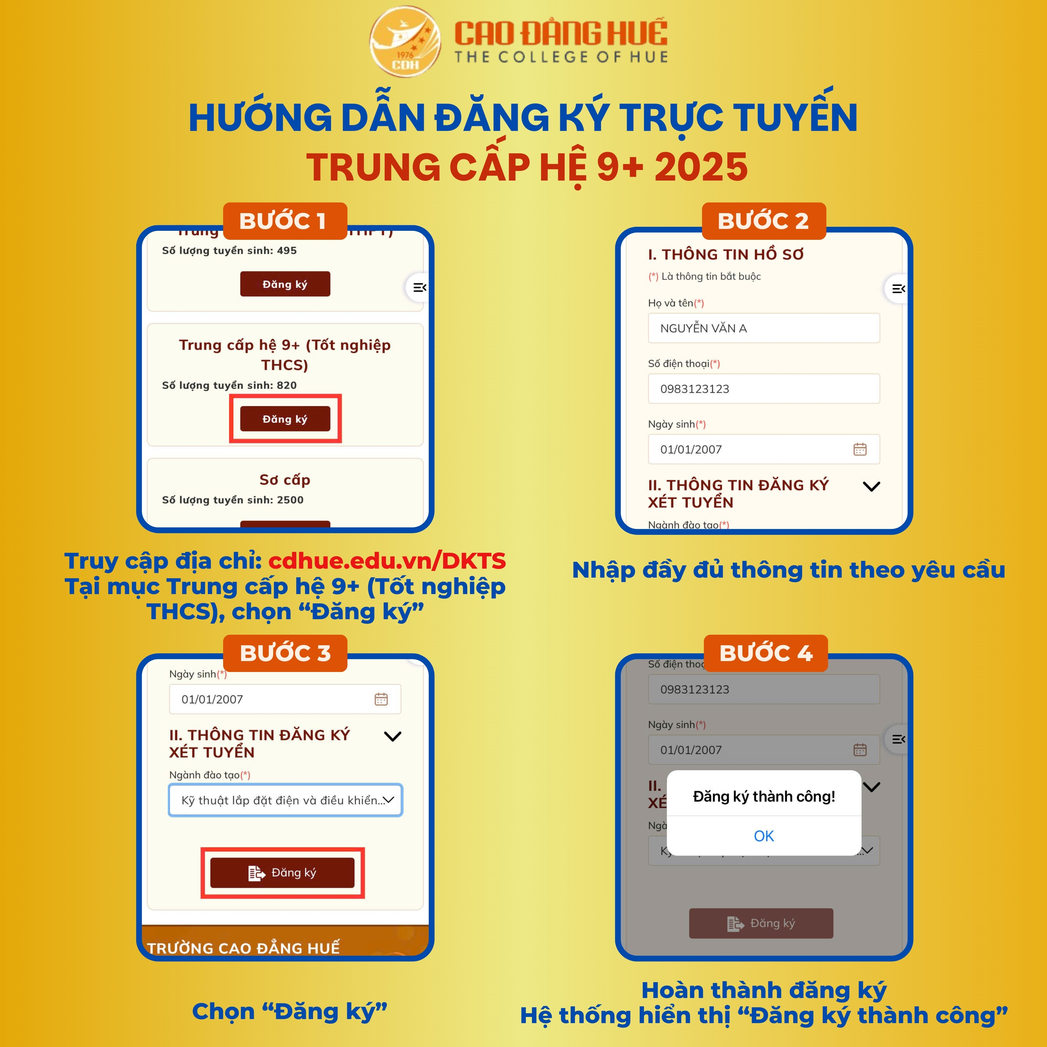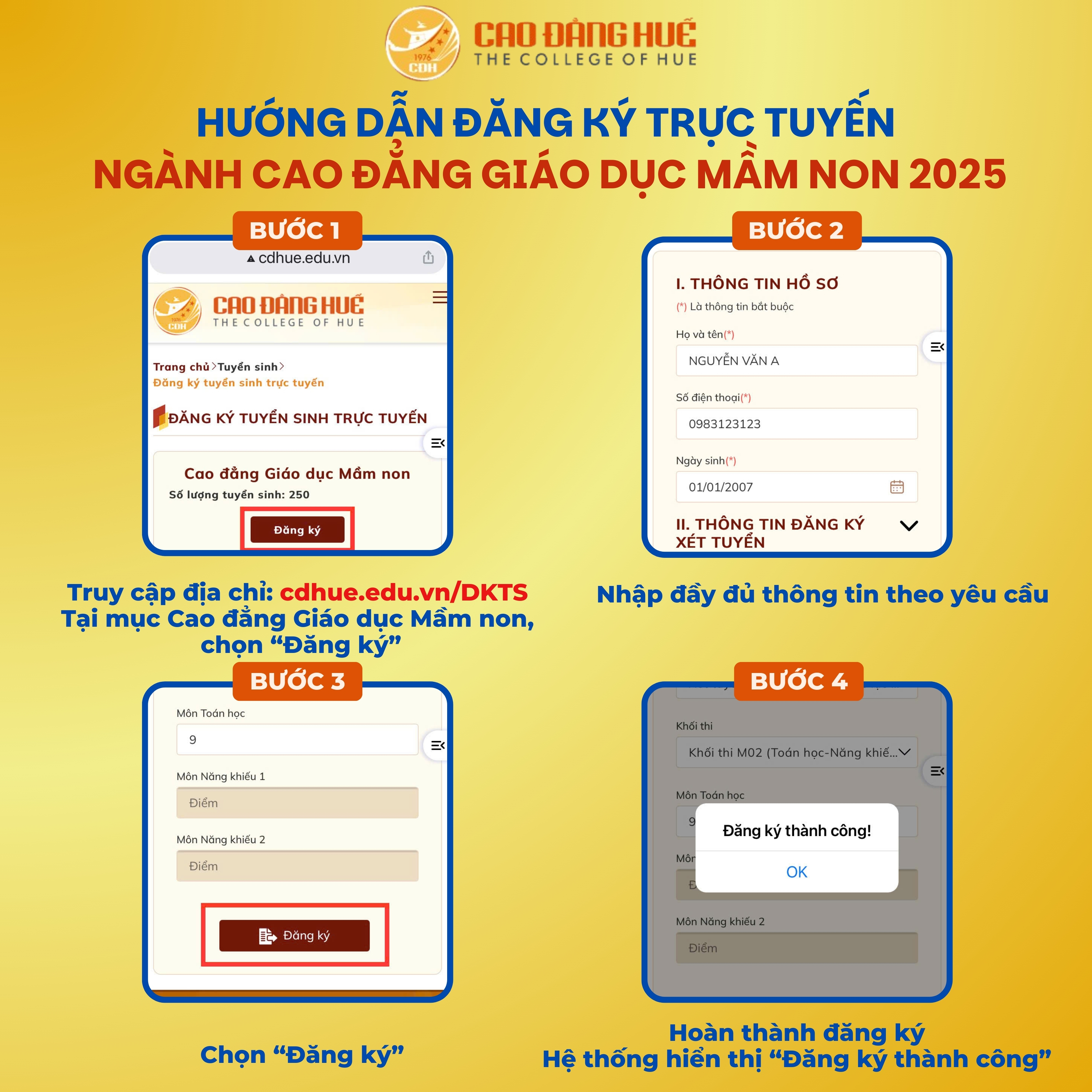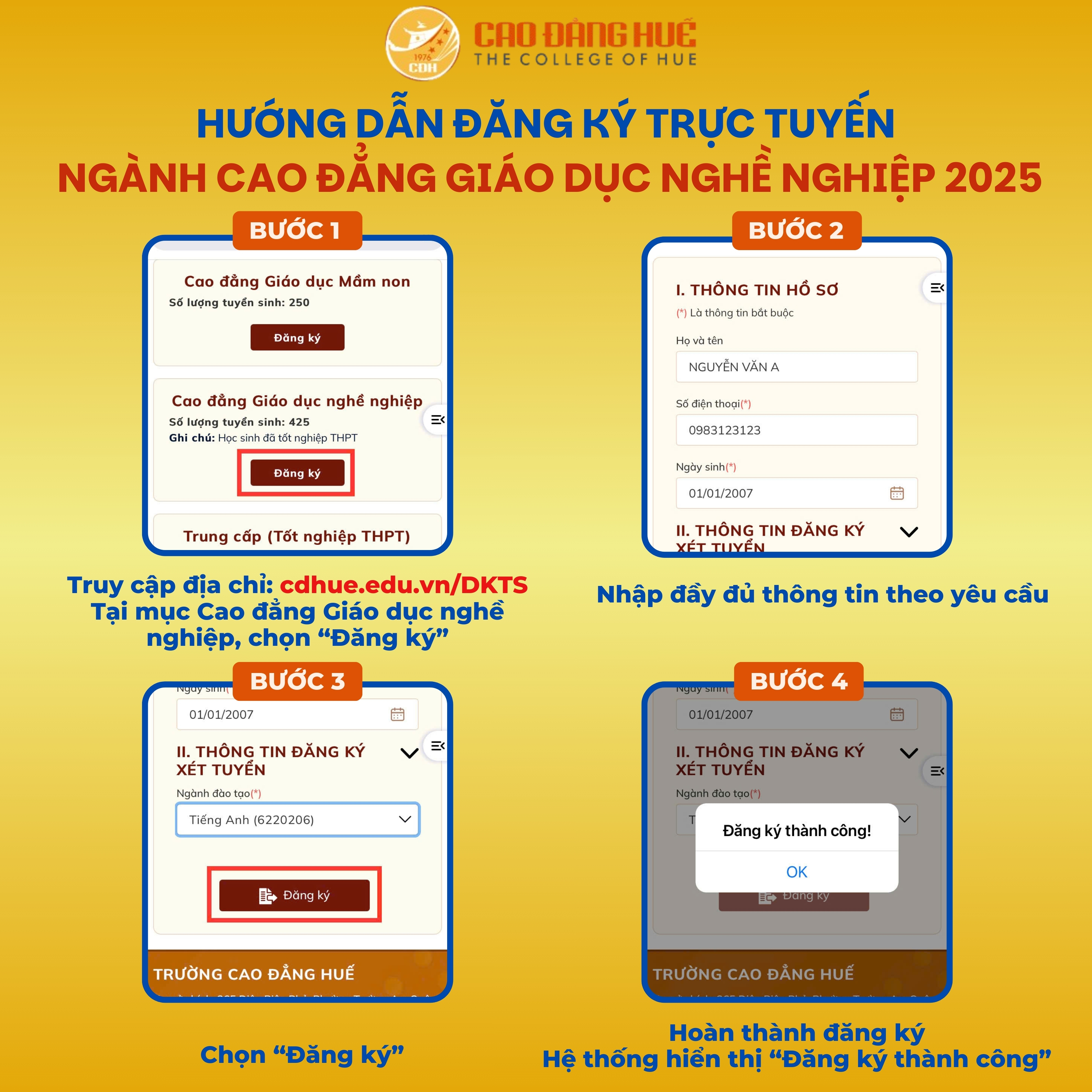 🌐 Đăng ký tuyển sinh trực tuyến: https://cdhue.edu.vn/dkts