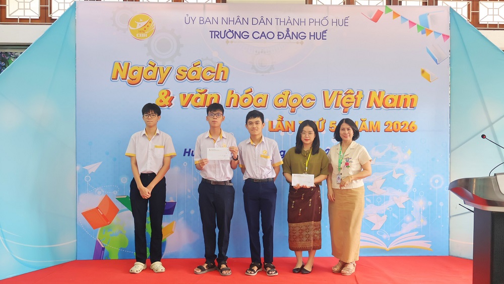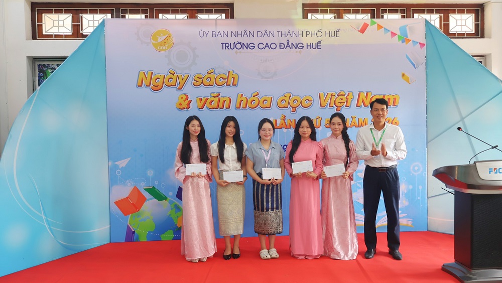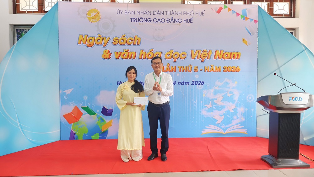Đại diện lãnh đạo Trường Cao đẳng Huế tặng thưởng cho các em học sinh, sinh viên đạt giải ở các cuộc thi nhân Ngày sách và văn hóa đọc Việt Nam do Nhà trường phát động