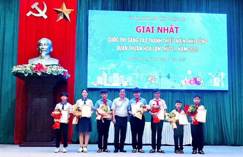 Lãnh đạo quận Thuận Hóa và giáo viên chụp ảnh lưu niệm cùng các học sinh đạt giải