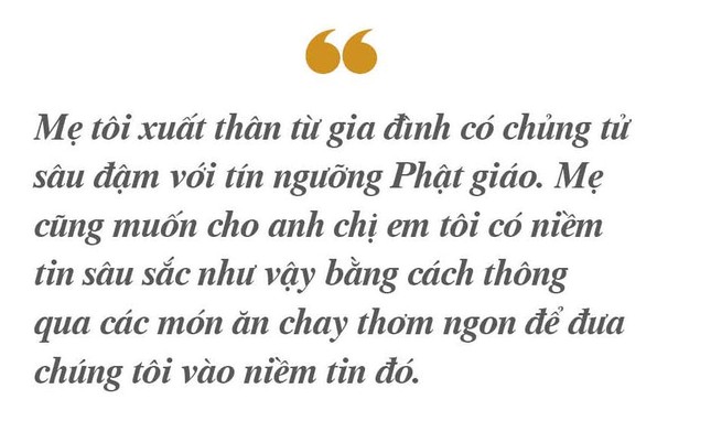 Như thường lệ mọi năm, vào ngày mồng một Tết, sau khi cả nhà đi xuất hành lên chùa về, ai nấy đều cảm thấy đói và mệt. Tết là dịp duy nhất để anh chị em tôi được phép mặc đồ đẹp suốt ngày, mẹ tôi cũng thế. Tôi không quên được hình ảnh mẹ tôi quấn hai vạt áo dài lên, lăng xăng chuẩn bị bữa cơm cho cả nhà. Mẹ tôi xuất thân từ gia đình có chủng tử sâu đậm với tín ngưỡng Phật giáo. Mẹ cũng muốn cho anh chị em tôi có niềm tin sâu sắc như vậy bằng cách thông qua các món ăn chay thơm ngon để đưa chúng tôi vào niềm tin đó.