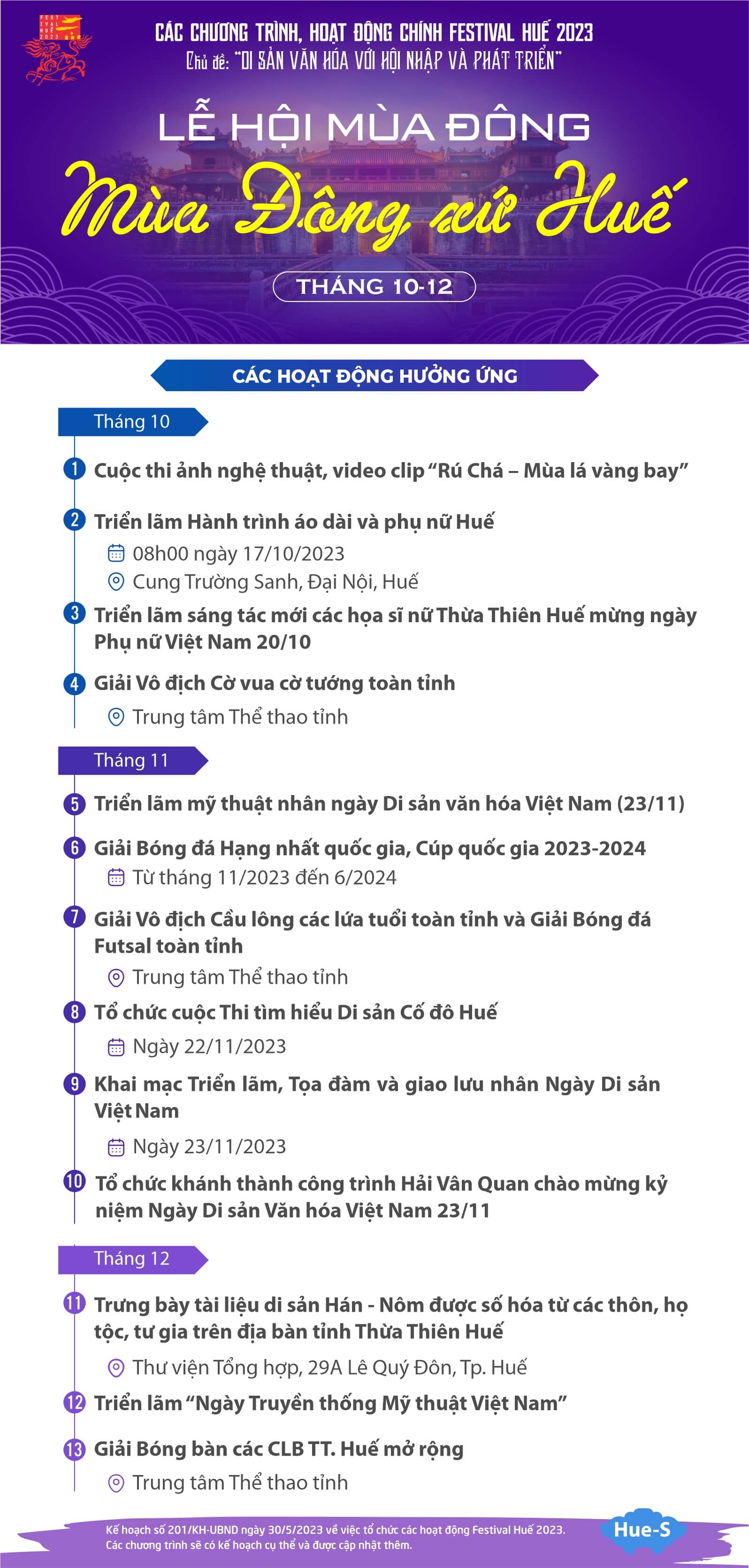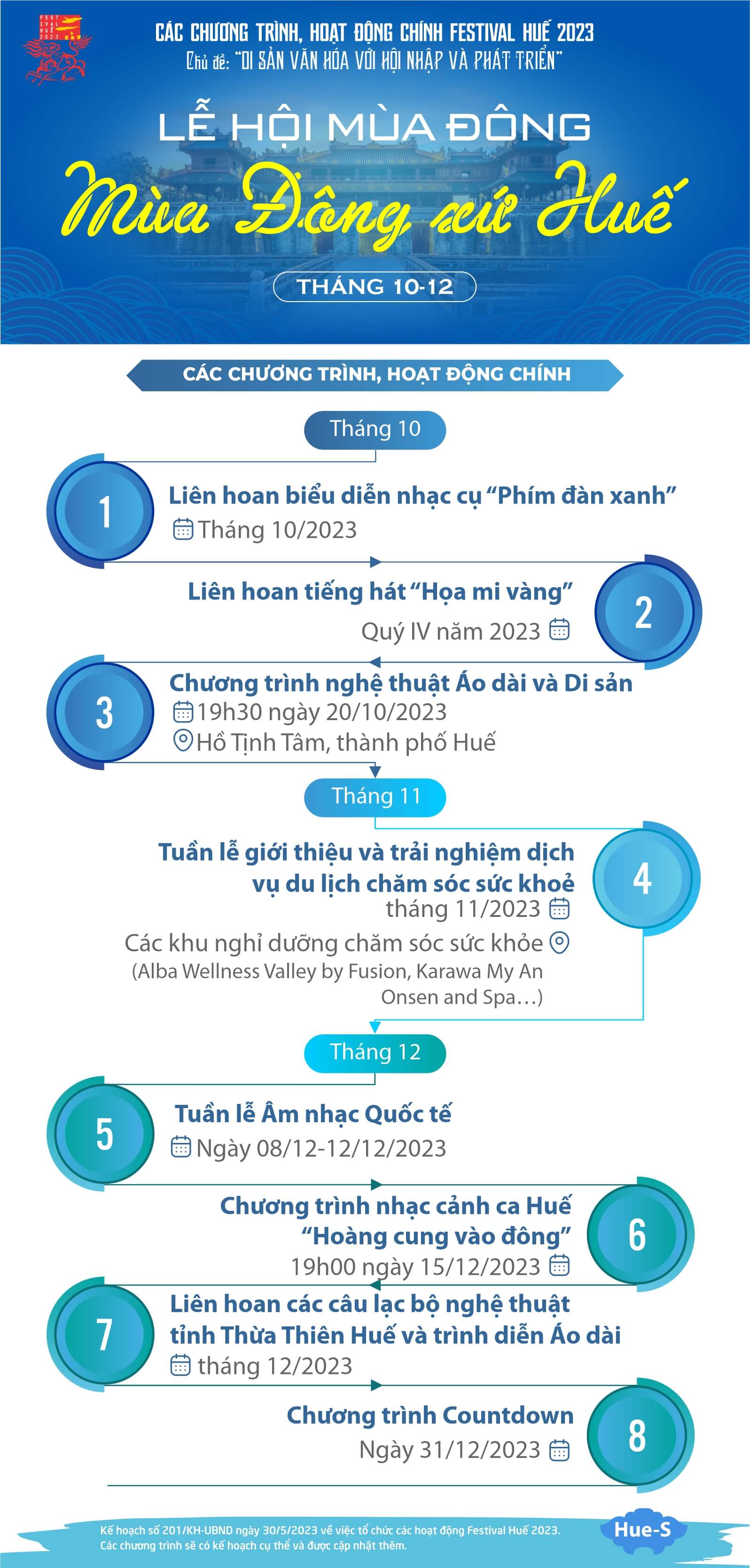Lễ Hội Mùa Đông với 8 hoạt động chính như: Liên hoan biểu diễn nhạc cụ “Phím đàn xanh” vào trung tuần tháng 10/2023; Wellness Festival - Tuần lễ Du lịch chăm sóc sức khỏe; Cuộc thi vẽ về di sản trong giới trẻ ngày 23/11; Chương trình “Chuyện kể Mùa đông xứ Huế” ngày 10/12; Festival Âm nhạc Quốc tế từ ngày 15 -21/12; Liên hoan tiếng hát “Họa mi vàng” trung tuần tháng 12; Liên hoan các câu lạc bộ nghệ thuật tỉnh Thừa Thiên Huế và trình diễn Áo dài; Chương trình Countdown ngày 31/12 sẽ kết thúc kỳ Festival Bốn mùa Huế 2023.