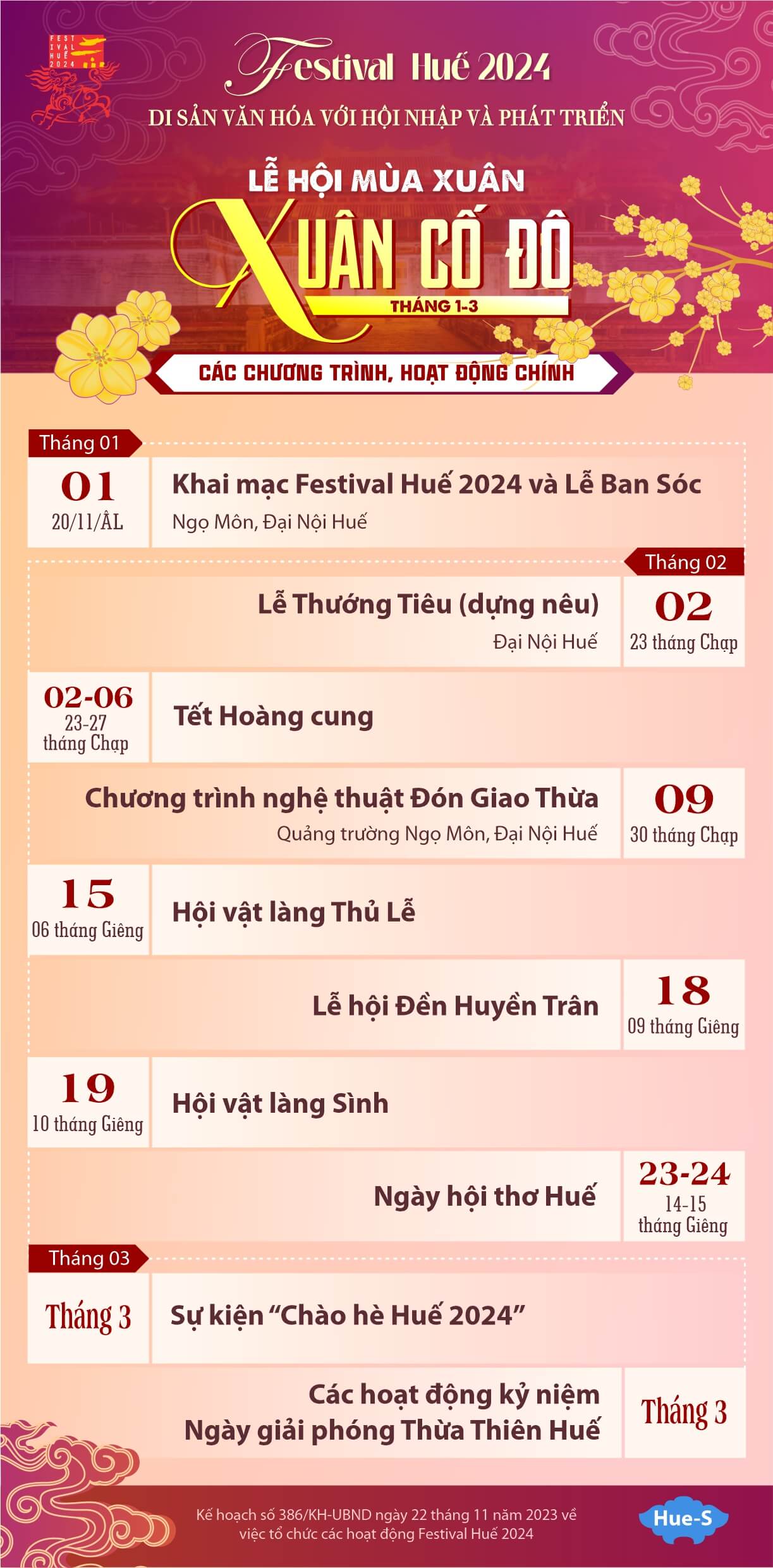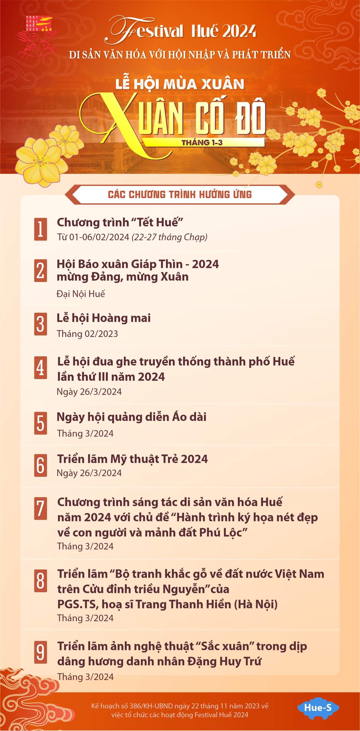 Dưới đây là chuỗi các hoạt động chính và hoạt động hưởng ứng của Lễ hội Mùa Xuân - Festival Huế 2024: